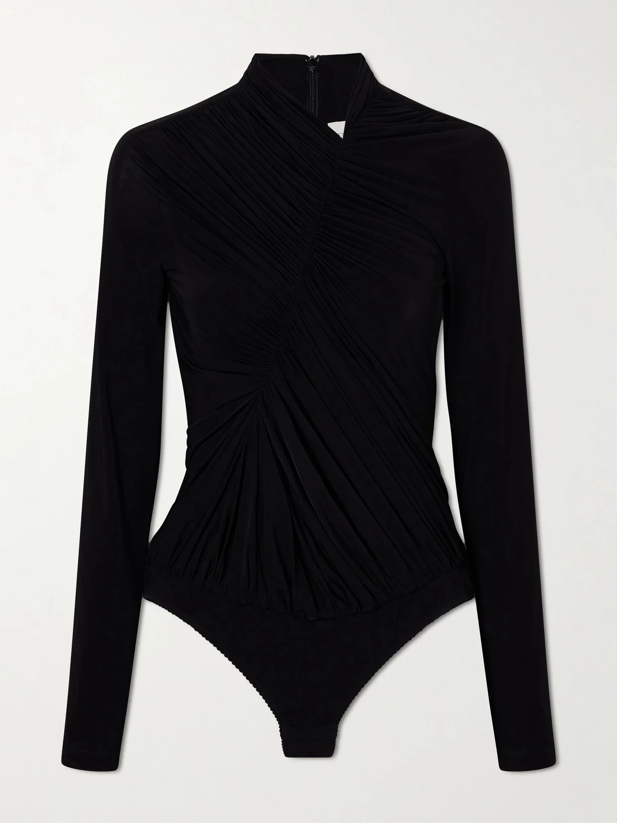 Stella McCartney blends contemporary design with timeless femininity in this bodysuit. Cut from crepe-jersey, it features a draped front that creates an asymmetric neckline, hugging the body and adding a fluid, sculptural feel. Pair it with jeans and heels to elevate a casual outfit with a chic, edgy twist.