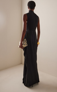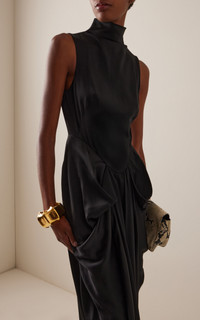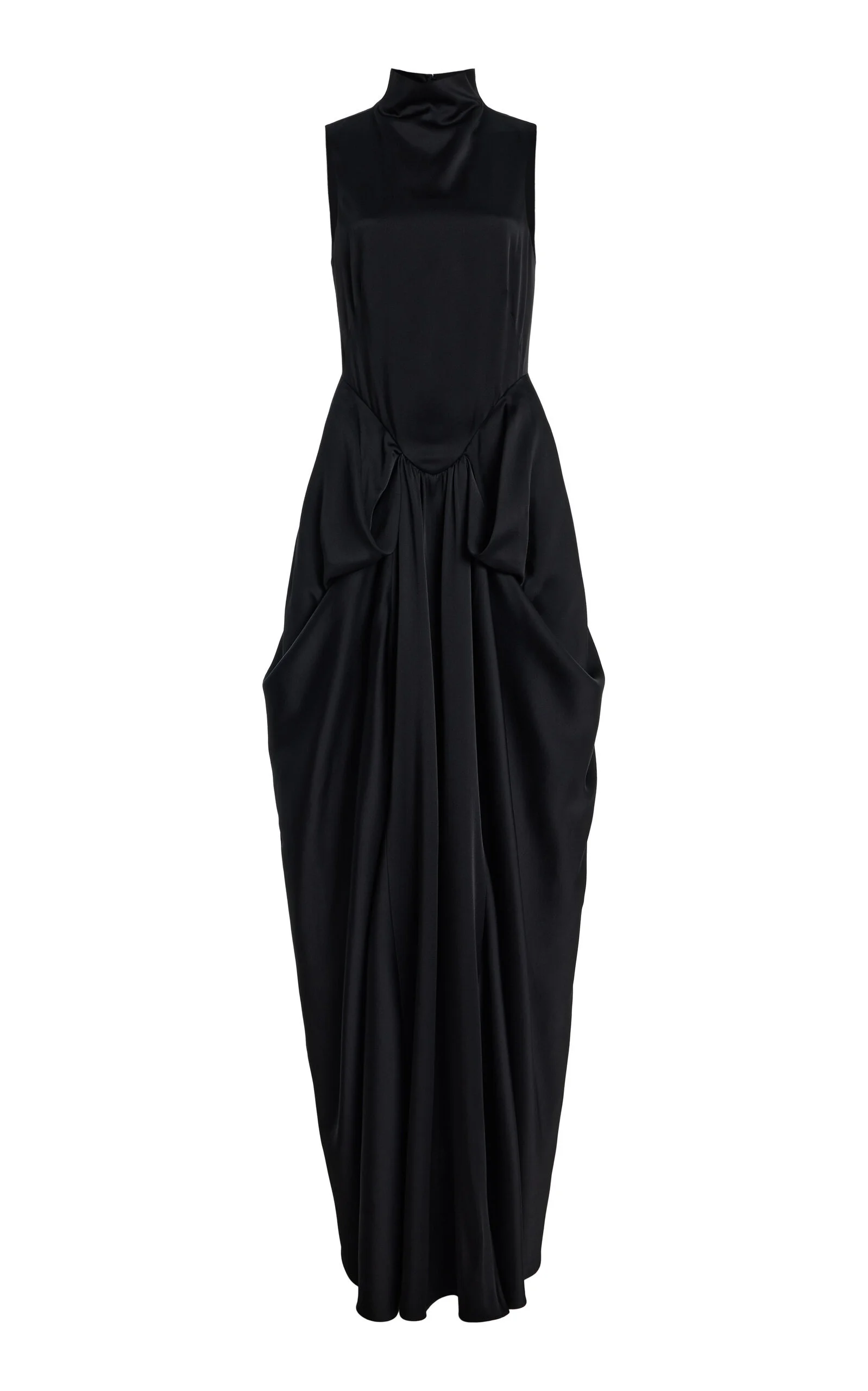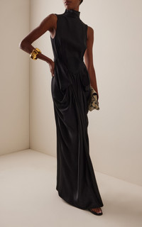 British designer Stella McCartney has become synonymous with sustainable fashion, ensuring the environment and community are front of mind. Made from sustainably sourced satin, this high-neck gown features a fitted bodice that falls to an intricately draped skirt. PRODUCT DETAILS - Pre-Fall '25 - Zip fastening - Composition: 73% acetate, 27% viscose - Dry clean - Made in Italy SIZE & FIT - Our model is wearing a size IT 38 - Model is 5'10" with a 31" bust, 23.5" waist, and 33.5" hip