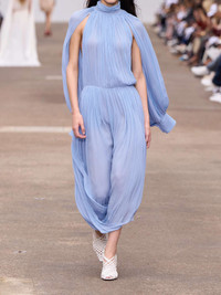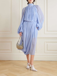 EDITORS'NOTES Stella McCartney's Spring '25 collection is inspired by birds and their graceful, fluid elegance. This dress is made from certified silk-crepon that's gathered along the high neckline and nipped-in waist for beautiful texture and movement. It has billowy sleeves and an open back. Echo the runway look with the designer's woven sandals. Lower-Impact Materials. This product is made using at least 50% lower-impact materials or ingredients. Find out more about our NET SUSTAIN criteria here. SIZE & FIT Model measurements: - Fits true to size, take your normal size - Designed for a loose fit - Lightweight, non-stretchy fabric - Model is 177cm/ 5'10" and is wearing an IT 40 - Bust: 81cm/ 32" - Waist: 63cm/ 25" - Hip: 91cm/ 36" DETAILS & CARE - Light-blue silk-crepon - Concealed zip fastening along side, hook fastening at back - 100% silk; lining: 100% viscose - Dry clean
