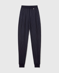 Item 6K10093S25718556 A casual take on the pinstripe story seen in our iconic Savile Row tailoring this season, these pants are spun from ultra-soft RWS-certified wool. Falling loosely, they are topped with an elasticated, ribbed waistband and cuffs. Pair them with the coordinating polo top. - Color: Navy - Pinstripe - Mid-rise - Flat waistband - Elasticated trims - Ankle-length cuffs - Two pockets - Slips on - Made in Italy Product Care & Fit Advice - Care: Dry clean only - Composition: 100% virgin wool - Fit: Regular fit - Sizing: Take your usual size - Model is 180cm or 5' 11"