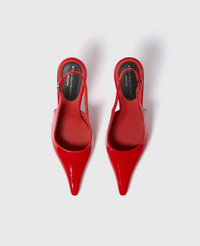Item 810460AP03806309 Primed for evenings out and everyday statements, our Elsa pump is refreshed as a sexy slingback. Handcrafted in Italy from our glossy, patent vegan leather alternative, it stands on a 90mm sculptural heel and is fitted with a comfortable, contrasting red lining – contemporizing a classic silhouette. - Color: Red - 90mm heel - Exaggerated pointed toe - Patent vegan leather alternative - Sculpted heel - Lead-free crystal-embellished buckle - Buckle fastening - Fully lined with post-consumer recycled PET - Lining is comfort-enhanced with padding and moisture-wicking technology - Handcrafted in Italy - All of our shoes and accessories are made from non-leather materials in keeping with our cruelty-free ethos. Product Care & Fit Advice Care: Spot clean only with soft damp cloth. Composition: 60% polyurethane, 25% polyester, 15% cotton Fit: True to size Heel height: 3.5 in
