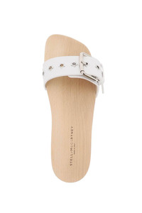 The Elyse Clogs by Stella McCartney are made from responsibly sourced wood, with a serrated rubber sole and an adjustable strap featuring a large buckle and metallic star-shaped eyelets. They have an anatomical sole and a square toe. PRODUCT DETAILS Made In: Italy Composizione: 57%PL-R 47%PU Heel Height: 4,5 cm Sole: Rubber, Traction Sole Supplier Color Code: WHITE Supplier Code: 810385 AP00P0 FTA: No Season: SS24