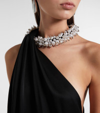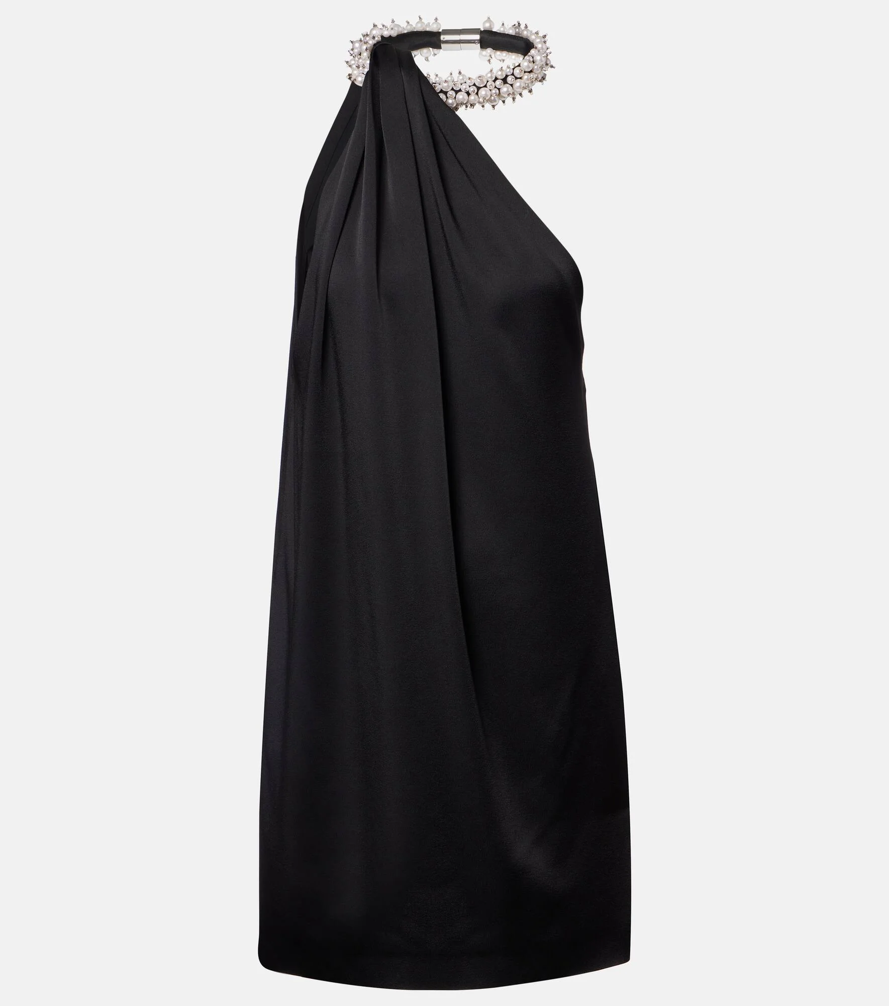 Step into your next event with confidence in this black minidress from Stella McCartney. Crafted from lustrous satin, the halterneck silhouette is elevated by a striking faux pearl-embellished collar for a touch of modern glamour. Product Details - Material: 73% acetate, 27% viscose - Care instructions: dry clean - Made in Italy - Designer color name: Black - Item color: black - Detachable collar - Hem: straight - Includes: dust bag - Item number: P01132528 Size & Fit - True to size - Straight fit - Non-stretchy fabric - The model seen in the picture is 178cm-5'10" and wearing a size IT 40