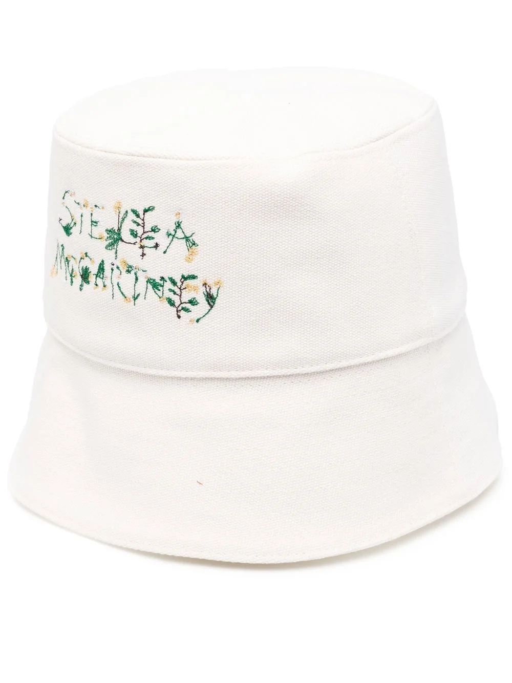 embroidered-logo bucket hat Highlights - White - Organic cotton - Textured finish - Embroidered logo to the front - Dropped narrow brim - Flat crown - Pull-on style Made in Italy Composition Organic Cotton 99%, Acrylic 1% SIZE & FIT Measurement BRIM 2.75 in(7 cm) CIRCUMFERENCE 22.44 in(57 cm)