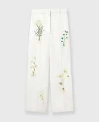 Item 6402423CU7049200 Savile Row tailoring is foundational to every Stella McCartney collection. For Spring 2025, these pants are immaculately constructed from fully traceable RWS-certified wool and tailored to a low-rise, straight-leg silhouette hand-embroidered with flowers. Pair them with the coordinating blazer. - Color: Cream - Low-rise - Floral embroidery - Belt loops - Two pockets - Pleats running down the center of each leg - Low crotch - Button and zipper-fly fastening - Made in Romania Product Care & Fit Advice Care: Dry clean only Composition: 97% wool, 3% elastane Fit: Loose fit Sizing: Take your usual size Midweight, non-stretch fabric
