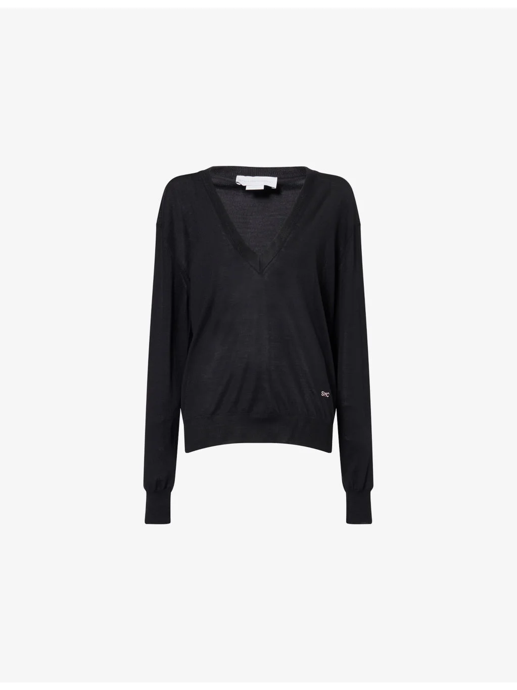 PRODUCT DETAILS - Stella McCartney wool jumper - 100% wool - Relaxed fit, V-neck, long sleeves, embroidered lettering at front, fine knit texture, ribbed trims - Hand wash - True to size - Model is 5ft 10in/1.78m and wears a size small - Lightweight, stretchy Ref: R04550413
