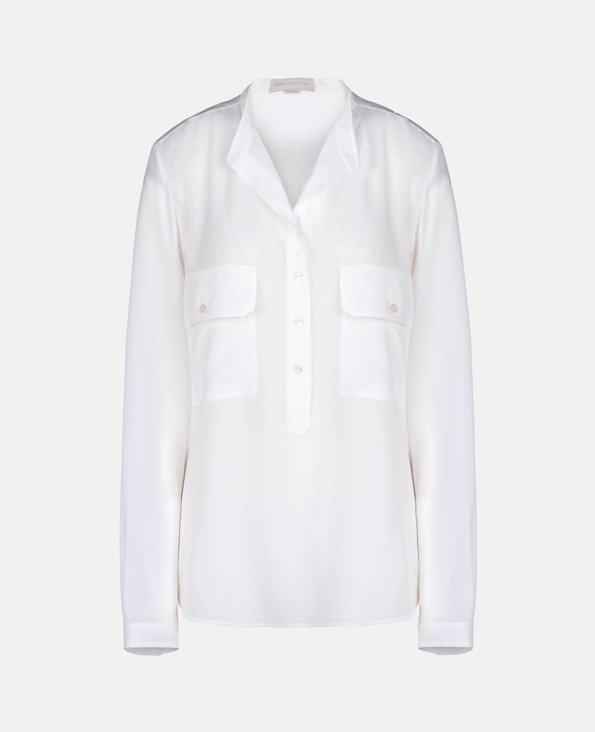 Item 531899SY2069000 Build your foundational staples with the Estelle silk shirt from Stella McCartney. In almond milk white, the shirt features an open stand collar and cargo pockets to the chest. Style yours with denim or tailored suit trousers. - Colour: White - Almond milk white - Silk - Stand collar - Long sleeves with button cuffs - Three-quarter button front - Two front chest cargo pockets Product Care & Fit Advice - Care: Dry clean only - Composition: 100% silk - Fits true to size - Designed for a regular fit - Model is 5ft 9.5in./1.77m, is a size UK08 and wears a size IT40 (US04/UK08/FR36)