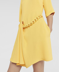 A play with proportions, this sunflower yellow mini dress pays homage to our iconic Falabella – placing its chain all over in a charming pattern. This dress is consciously crafted from forest-friendly viscose with a gathered skirt, drawn together by a tonal Falabella chain belt. - Colour: Sunflower Yellow - Warm sunflower yellow - Stretch forest-friendly viscose - Crew neck - Mid-length sleeves - Gathered skirt - Tonal Falabella chain at front - Concealed back zip fastening - Two front slant pockets - Made in Bulgaria Product Care & Fit Advice - Care: Dry clean only - Composition: Main fabric: 96% viscose, 4% elastane, Belt: 100% methacrylate
