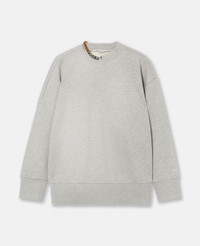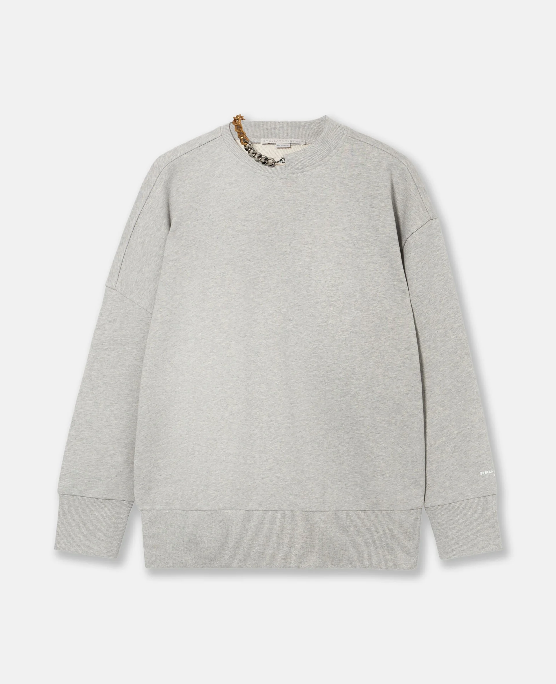 Item 6J03273SPZ361264 Elevate your athleisure with this off-duty essential from Fall 2024. Spun from organic cotton, it’s topped with Stella McCartney’s iconic Frayme chain in recycled brass and recyclable aluminum by the neckline. - Color: Gray - Light gray melange - Crewneck - Dual-tone chain detail at neck - Ribbed trims - Slips on - Made in Portugal Product Care & Fit Advice Care: Dry clean only Composition: Main fabric: 100% cotton Size: Fits true to size Designed for a regular fit Midweight, slight stretch fabric