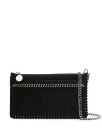 Falabella clutch bag Highlights - Black - Faux leather - Textured finish - Whipstitch trim - Signature diamond-cut chain-link trim - Logo charm - Slip pocket to the front - Adjustable wrist strap - Main compartment - Internal zip-fastening pocket - Internal card slots - Logo-jacquard lining - Silver-tone hardware - Top zip fastening - We've partnered with good on you â an independent agency that rates how brands perform in relation to their impact on the planet, people and animals, with a multi-criteria rating simplified to a five points scale. in order to be awarded our conscious label, larger brands need to score a minimum of four out of five ('good'), while smaller brands must score at least three out of five ('it's a start'). - This item comes from a brand rated four out of five ('good') by good on you at the time it was added on farfetch. please note, this is a brand-level rating and does not guarantee that this product is made with conscious materials. - Learn more about what makes a product conscious on our conscious criteria page Made in Italy Composition Outer: Polyurethane 100% SIZE & FIT Model measurements Height 5 ft 9 in(1.76 m) Bust/Chest 31.49 in(80 cm) Hips 36.61 in(93 cm) Waist 24.4 in(62 cm) Measurement HANDLE 8.26 in(21 cm) HEIGHT 5.11 in(13 cm) WIDTH 8.66 in(22 cm)