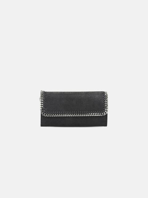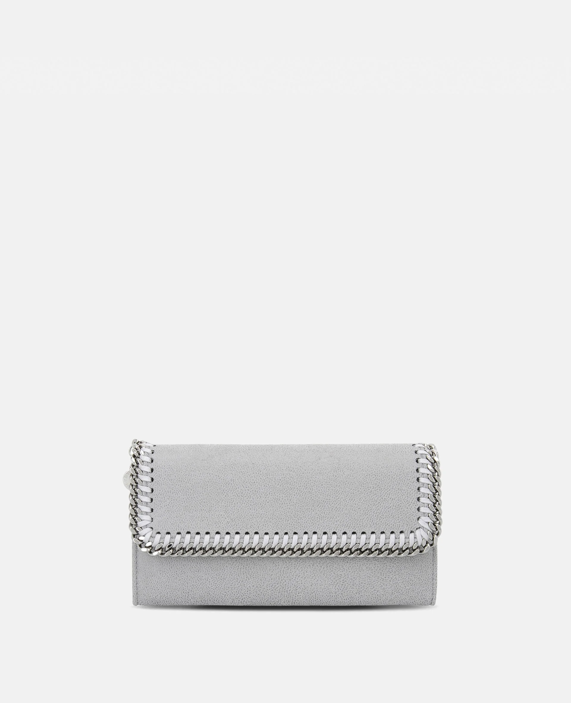 Item 430999W91321220U With space for cards and cash, this Falabella flap continental wallet is an everyday companion. The wallet is crafted from our matte vegan Shaggy Deer fabric with a semi-gloss grain and a recycled brass and aluminium diamond-cut chain. - Colour: Grey - Medium steel grey - Matte vegan Shaggy Deer fabric with semi-gloss grain - Signature ruthenium recycled brass and aluminium diamond-cut chain - Waxed GOTS-certified organic cotton lacing - One main compartment - Zip coin pocket - Eight card slots - Press stud fastening - Engraved ruthenium zamac logo medallion charm - Fully lined with recycled materials - Made in Italy Product Care & Fit Advice - Care: Use a soft damp cloth with a small amount of demineralised water (likewise for ironing) and apply to all the material. Leave the bag to dry. Avoid scrubbing to prevent damaging the surface of the bag. As this accessory is made from very delicate fabric, we recommend handling with care and avoiding contact with any sharp objects, jewellery, or rough surfaces. When not in use, always store the item in its protective bag. - Composition: Main fabric: 55% polyester, 45% GRS-certified Newlife™ post-consumer recycled polyester, Trims: 70% solventless polyurethane, 30% post-consumer recycled polyester, Lacing: 100% GOTS-certified organic cotton with corn starch wax coating, Chain: 100% aluminium, Medallion: 100% zamac, Magnet: 100% stainless steel, Lining: GRS-certified post-consumer recycled polyester - Size: 19.5 x 10.5 x2.5cm - Weighs approximately 0.2kg - All of our shoes and accessories are made from non-leather materials in keeping with our cruelty-free ethos.