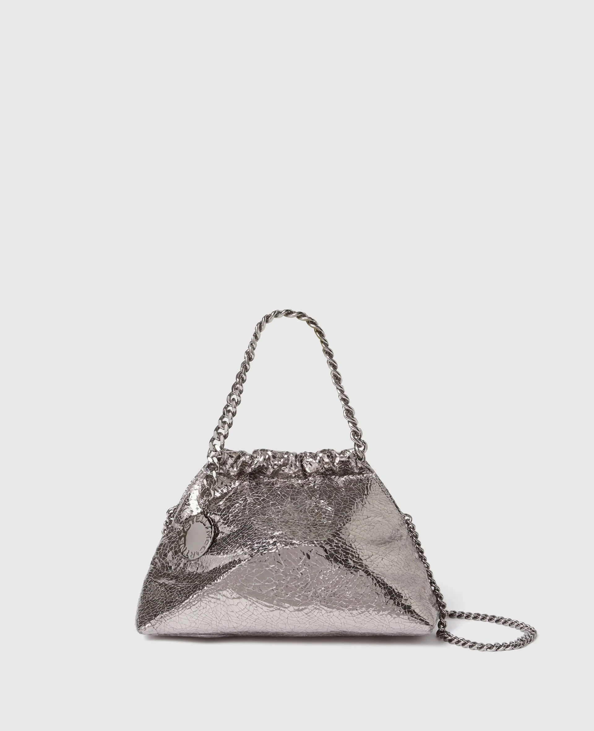 Item 7B0144WP05871113U The new Falabella drawstring crossbody bag reimagines our vegan icon, with a cracked metallic finish on cruelty-free materials. A signature diamond-cut recycled brass and recyclable aluminum chain serves as a shoulder strap, with enough room for your phone, wallet and daily essentials. Fully lined with monogrammed recycled fabric, wear it over the shoulder or sling it across your ensemble for a classic day-to-night look. - Color: Silver - Comfortably fits all phones and wallets alongside daily essentials - Vegan leather alternative - Cracked metallic finish - Signature recycled brass and aluminum diamond-cut crossbody chain - Waxed GOTS-certified organic cotton lacing - Two top handles - One crossbody strap - One main compartment - One internal zipper pocket - Magnetic snap fastening - Engraved logo medallion charm - Recycled polyester monogram lining - Handcrafted in Italy Product Care & Fit Advice - Care: Spot clean only with soft damp cloth. - Composition: 100% Polyester - Fit: Fits all phones, wallets and small daily essentials. - Size: 8.6 x 5.7 x 3.9 in - Strap length: 8.2 in - Weighs approximately 18.8 oz