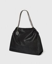 Item 7B0141W91321000U New for Spring 2025, the Falabella drawstring tote bag provides a fresh take on our iconic Falabella. A signature diamond-cut recycled brass and aluminium chain serves as a shoulder strap, with enough room for a laptop and more. Fully lined with monogrammed recycled fabric, wear the vegan Baby Bella over your shoulder for a classic day-to-night look. - Color: Black - Comfortably fits all tablets and laptops alongside daily essentials - Matte vegan Shaggy Deer fabric with semi-gloss grain - Signature gold recycled brass and aluminum diamond-cut chain - Waxed GOTS-certified organic cotton lacing - Two top handles - One main compartment - One internal zipper pocket - Magnetic snap fastening - Engraved gold logo medallion charm - Recycled polyester monogram lining - Handcrafted in Italy Product Care & Fit Advice Care: Spot clean only with soft damp cloth. Composition: 100% Polyester - Fit: Comfortably fits all tablets and laptops alongside daily essentials. - Size: 18.3 x 14.9 x 6.6 in - Handle drop: 8.6 in - Weighs approximately 34.9 oz