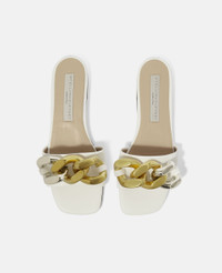Signature for its bicolour gold and silver diamond-cut chunky chain, the Falabella flat returns in refreshed colourways – adding a touch of evening glamour to Autumn wardrobes. - Colour: White - Falabella slides - Signature two-tone gold and silver diamond-cut chunky chain - Slip-on style - Made in Italy Product Care & Fit Advice - Care: Spot clean only with soft damp cloth - Composition: Upper: 51% Polyester, 49% Aliphatic solvent; Lining: 64% Polyurethane, 36% Viscose; Outsole: 100% Thunit - 5 mm heel height - Fits true to size - All of our shoes and accessories are made from non-leather materials in keeping with our cruelty-free ethos.