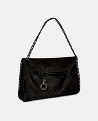 - Color: Black - 3-chain Falabella fold-over tote - Signature black diamond-cut chain - Slip pocket, press stud fastening - Made in: Italy - Care: Spot clean only with soft damp cloth - Composition: - Main Material: 100% Polyester - Lining: 100% Recycled Polyester - Details: 67% Polyurethane, 33% Polyester - Do not machine wash - Do not bleach - Do not tumble dry - Do not iron - Do not dry clean - Clean with a damp cloth - Size: 37x36x9 cm / 14.5x14x3.5 in. - Weighs approximately 0.85 kg - This tote can be worn two ways, folded over as a shoulder bag or as a handheld toteAll of our shoes and accessories are made from non-leather materials as part of our cruelty-free ethos.
