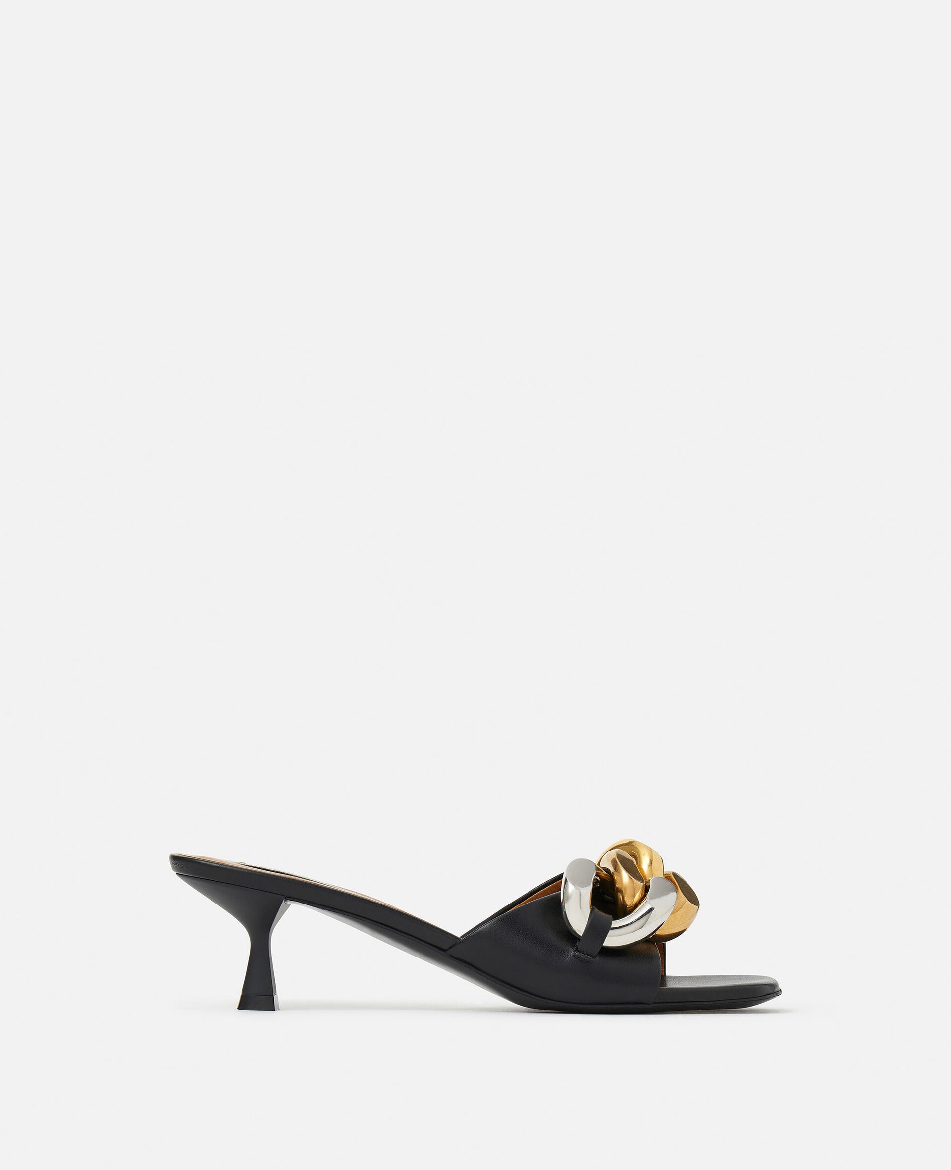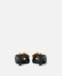 - Color: Black - Kitten mule - Signature Falabella bicolor gold and silver diamond-cut chunky chain - Made in: Italy Product Care & Fit Advice - Care: Spot clean only with soft damp cloth - Composition: Upper 51% Polyester, 49% Alifatica solvent; Lining 64% Polyurethane, 36% Viscose; Outsole 100% Vegan Thuni - 50 mm platform - Fits true to size - All of our shoes and accessories are made from non-leather materials as part of our cruelty-free ethos.