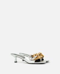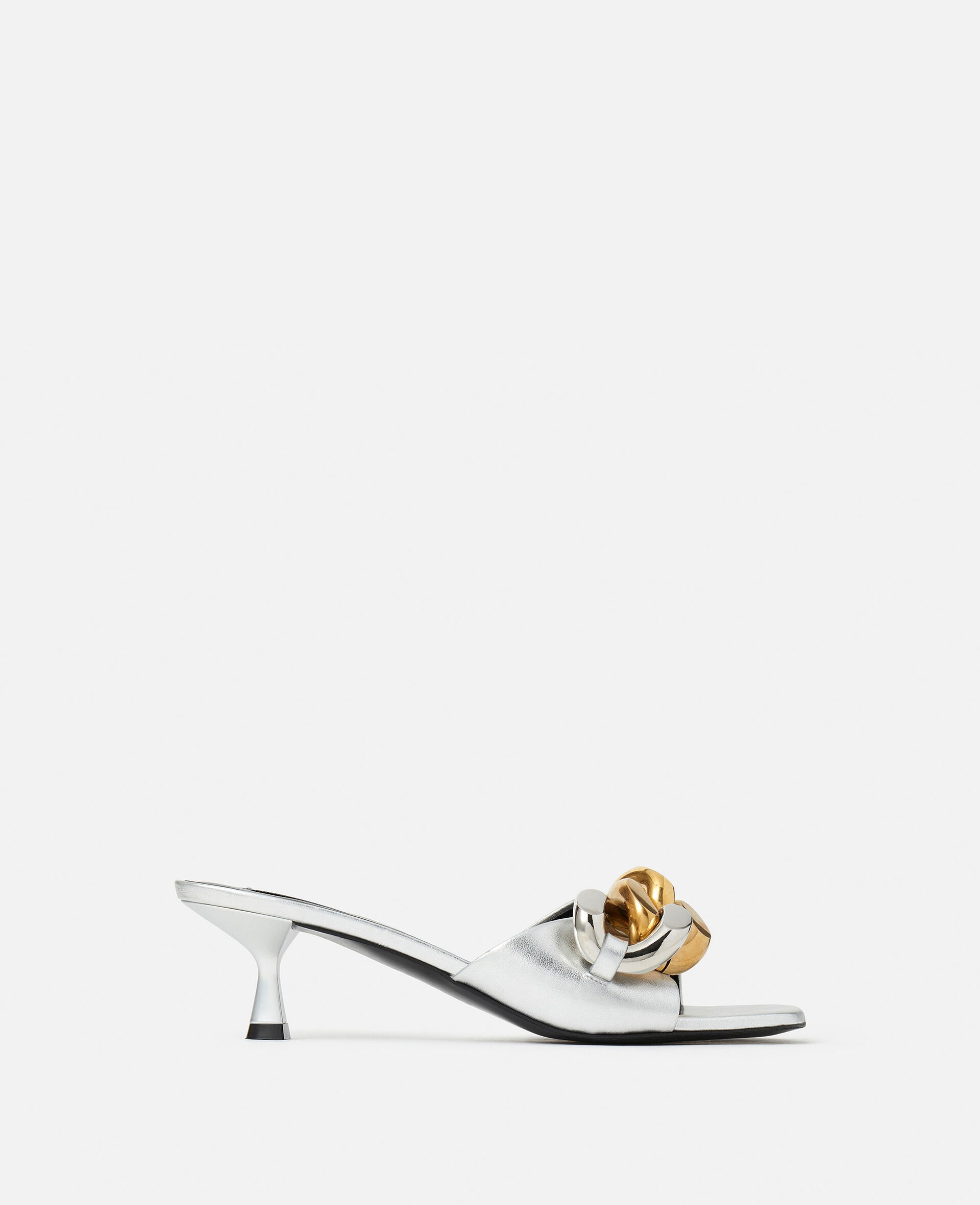 - Color: Silver - Falabella kitten mule - Signature two-tone gold and silver diamond-cut chunky chain - Made in: Italy Product Care & Fit Advice - Care: Spot clean only with soft damp cloth - Composition: Upper 51% Polyester, 49% Aliphatic Solvent; Lining 64% Polyurethane, 36% Viscose; Outsole 100% Vegan Thuni - 50 mm/2 in. platform - Fits true to size - All of our shoes and accessories are made from non-leather materials as part of our cruelty-free ethos.