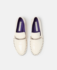 Item 810298AP02109002 Borrowing from menswear aesthetics, our square-toed Falabella loafers are refreshed with saddle stitching around the midsole and a slim iconic Falabella chain. - Colour: Ivory - Almond milk cream - Alter Mat vegan alternative to animal leather - Silver Falabella diamond-cut recycled brass chain around heel - Saddle stitching around midsole - Angular square toe - Slip-on style - Fully lined - Made in Italy Product Care & Fit Advice - Care: Spot clean only with soft damp cloth - Composition: Upper: 65% polyurethane, 35% polyester - 20mm sole - Fits true to size - All of our shoes and accessories are made from non-leather materials in keeping with our cruelty-free ethos.