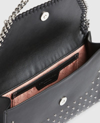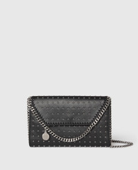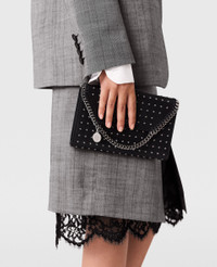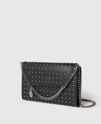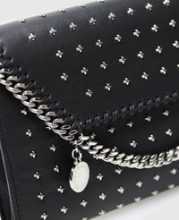 Item 581238WP06111000U This limited-edition Falabella crossbody bag is part of an exclusive capsule, celebrating and elevating our icon's legacy of cruelty-free craft. Made in Italy, all-over silver star studs are hand-placed – inspired by our vegan luxury bag's rock 'n' roll heritage and attitude. This immediately recognizable Stella McCartney bag is sculpted from mycelium-based YATAY M innovations and can carry your phone, keys and lipstick. - Color: Black - Comfortably fits all phones and all wallets alongside small daily essentials - YATAY M mycelium-based vegan leather alternative - Star-shaped studs all-over - Signature ruthenium recycled brass and aluminum diamond-cut chain - Waxed GOTS-certified organic cotton lacing - One shoulder strap - One main compartment - One internal slip pocket - Magnetic snap fastening - Engraved ruthenium logo medallion charm - Fully lined with recycled materials - Made in Italy Product Care & Fit Advice - Care: Spot clean only with soft damp cloth. - Composition: 100% Polyester - Fits all phones and wallets. - Size: 8.6 x 5.5 x 0.9 in - Strap length: 20.4 in - Weighs approximately 13.4 oz - All of our shoes and accessories are made from non-leather materials in keeping with our cruelty-free ethos.
