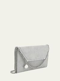 Stella McCartney "Falabella" crossbody wallet in faux leather with deerskin effect. Signature whipstitching and curb-chain detail. Chain shoulder strap. Flap top with snap closure. Inside, logo fabric lining; one interior pocket. 5.5"H x 8.7"W x 1"D. Made in Italy. Online Inquiries: BGS21_V54BP| Store Inquiries: #3141555
