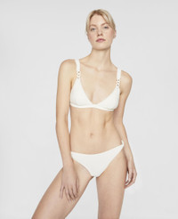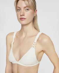 Capture the joy of sun-soaked spontaneity with this padded triangle bikini top. Anchoring a sense of inherent sexiness and youthful playfulness, it is crafted from recyclable nylon with gold-toned logo clasps. Our iconic Falabella chain is reimagined in a chunky, lightweight and tonal recyclable plastic on the shoulder straps, an attention-commanding detail. - Colour: Cream - Padded Triangle Bra - Removable padding - Chunky chain on straps - Gold-toned Stella McCartney logo clasps on the back Product Care & Fit Advice - Care: Hand wash, do not iron, do not dry clean, do not tumble dry, do not apply chlorine bleach - Composition: 78% Polyamide, 22% Recycled Polyamide - Model is 5’11/1.8 m, Bust 32, Waist 25, Hips 35 - Shown wearing a size S