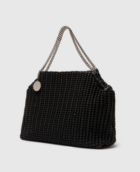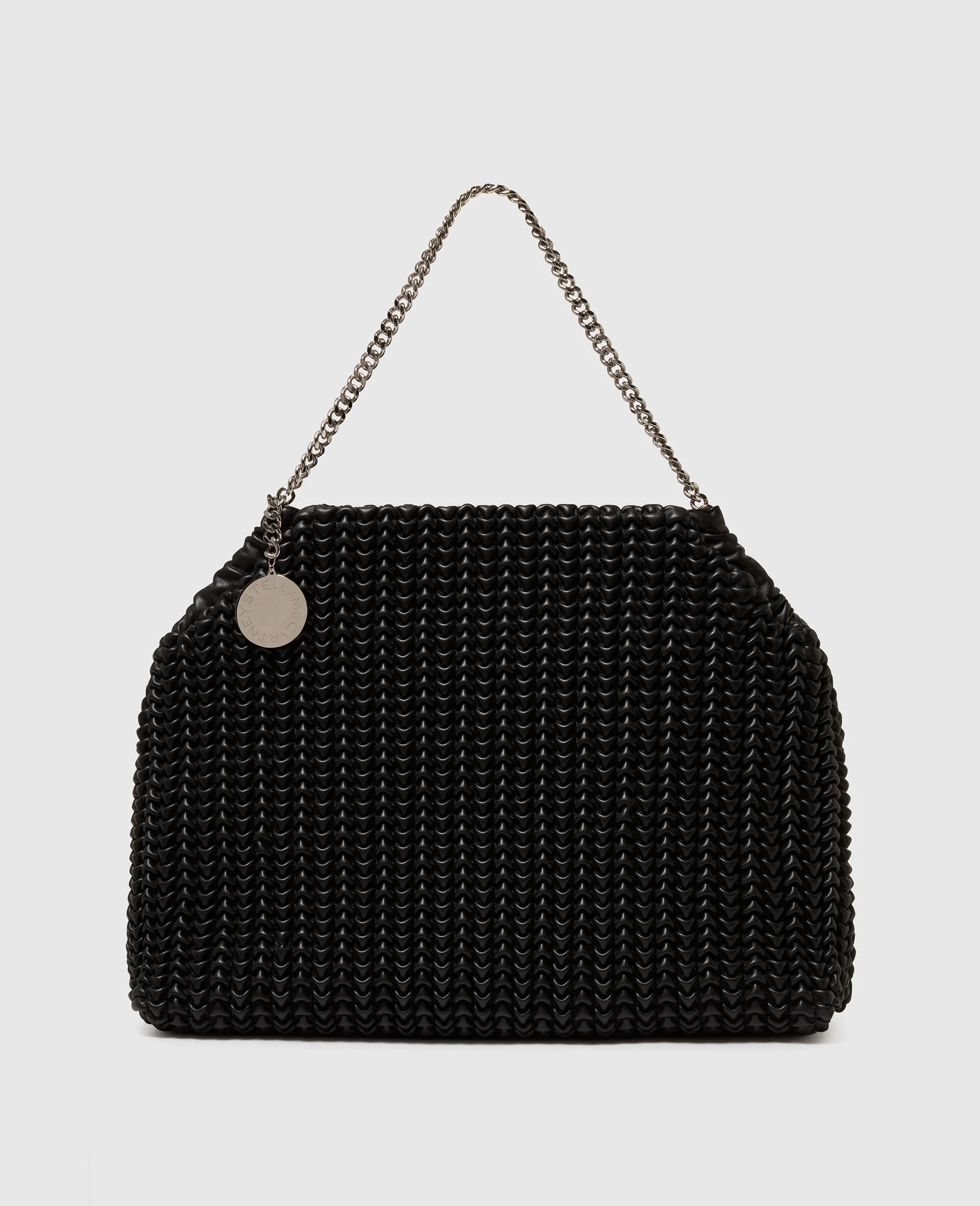 Item 7B0141WP06181000U The new Falabella drawstring tote bag reimagines our vegan icon, with a tight, rippled popcorn-texture all-over. A signature diamond-cut recycled brass and recyclable aluminum chain serves as a shoulder strap, with enough room for your phone, wallet and daily essentials. Fully lined with monogrammed recycled fabric, wear it over the shoulder for a classic day-to-night look. - Color: Black - Comfortably fits all phones and wallets alongside daily essentials - Vegan alternative to animal leather in all-over popcorn texture - Signature recycled brass and aluminum diamond-cut chain - Two shoulder straps - One main compartment - One internal zipper pocket - Magnetic snap fastening - Engraved logo medallion charm - Recycled polyester monogram lining - Handcrafted in Italy Product Care & Fit Advice - Care: Spot clean only with soft damp cloth. - Composition: 100% Polyester - This is a coated fabric - Fit: Fits all phones and small daily essentials. - Size: 18.3 in × 6.7 in × 15.0 in - Strap length: 8.6 in