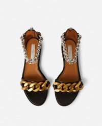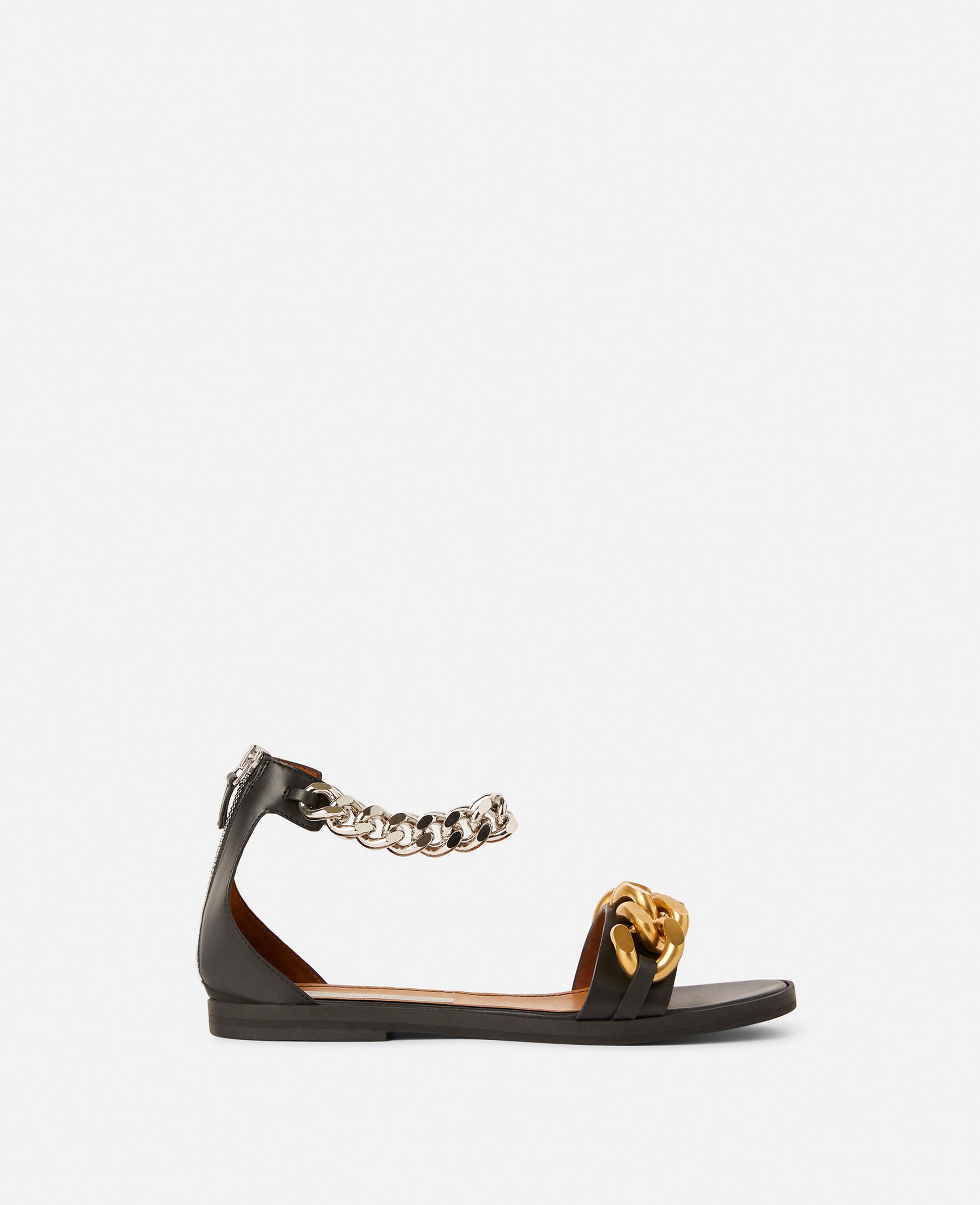 - Color: Black - Falabella Sandal - Signature gold and silver diamond-cut chunky chain - Zipper fastening - Made in: Italy Product Care & Fit Advice - Care: Spot clean only with soft damp cloth - Composition: 70% Polyurethane, 15% Polyamide, 15% Polyester - 10 mm sole - True to size - All of our shoes and accessories are made from non-leather materials as part of our cruelty-free ethos.