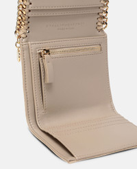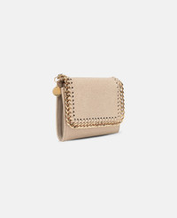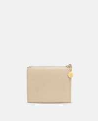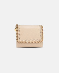 - Colour: Butter Cream - Falabella small flap wallet - Signature silver diamond-cut chain - 6 card slots, 1 main pocket - Zip coin purse - Made in: Italy - Care: Spot clean only with soft damp cloth - Composition: Main Material 100% Recycled Polyester, Lining 100% Recycled Polyester, Details 70% Polyurethane, 30% Recycled Polyester - Do not machine wash - Do not bleach - Do not tumble dry - Do not iron - Do not dry clean - Clean with a damp cloth - Size: 12x10x2.5 cm - Weighs approximately 0.13 kg - All of our shoes and accessories are made from non-leather materials as part of our cruelty-free ethos.