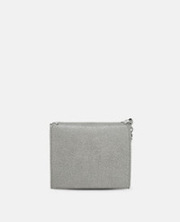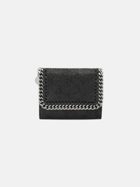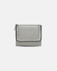 - Colour: Gray - Falabella small flap wallet - Signature silver diamond-cut chain - 6 card slots, 1 main pocket - Zip coin purse - Made in: Italy - Care: Spot clean only with soft damp cloth - Composition: Main Material 100% Recycled Polyester, Lining 100% Recycled Polyester, Details 70% Polyurethane, 30% Recycled Polyester - Do not machine wash - Do not bleach - Do not tumble dry - Do not iron - Do not dry clean - Clean with a damp cloth - Size: 12x10x2.5 cm - Weighs approximately 0.13 kg - All of our shoes and accessories are made from non-leather materials as part of our cruelty-free ethos.