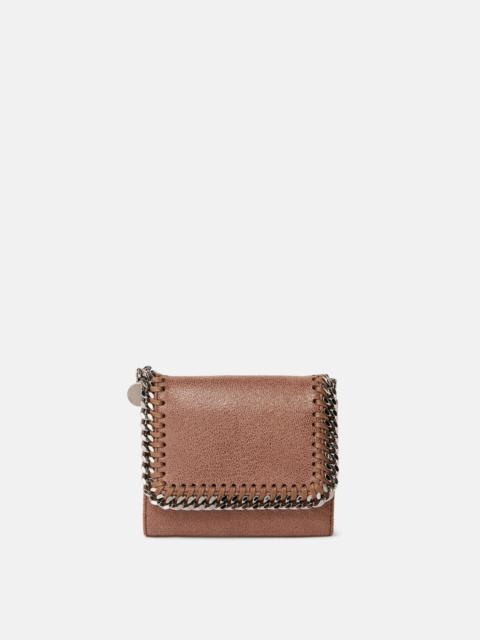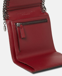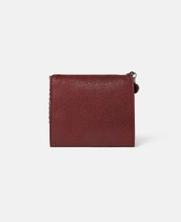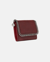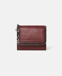 - Color: Ruby - Falabella small flap wallet - Signature silver diamond-cut chain - 6 card slots, zip coin purse - Made in: Italy - Care: Spot clean only with soft damp cloth - Composition: Main Material 100% Polyester, Lining 100% Recycled Polyester, Details: 70% Polyurethane, 30% Polyester - Do not machine wash - Do not bleach - Do not tumble dry - Do not iron - Do not dry clean - Clean with a damp cloth - Size: 12x10x2.5 cm - Weight approximately 0.13 kg - All of our shoes and accessories are made from non-leather materials as part of our cruelty-free ethos.