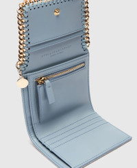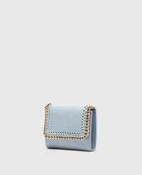 Item 431000WP04044761U The natural companion to our iconic Falabella tote bag, this Falabella small flap wallet is carefully considered and consciously handcrafted in Italy. From its pocket organization to its cruelty-free, vegan Shaggy Deer fabric with a metallic grain, this compact purse includes room for notes, small change and up to six credit cards. - Color: Duck Egg - Matte Shaggy Deer vegan leather alternative with a metallic finish - Signature recycled brass and recyclable aluminum diamond-cut chain - Waxed GOTS-certified organic cotton lacing - Zipper coin pocket - Eight card slots - Magnetic snap fastening - Engraved zamak logo medallion charm - Recycled polyester monogram lining - Handcrafted in Italy - All of our shoes and accessories are made from non-leather materials in keeping with our cruelty-free ethos. Product Care & Fit Advice - Care: Spot clean only with soft damp cloth. - Composition: 100% Polyester - Fit: Comfortably fits up to eight cards. - Size: 4.7 x 3.9 x 0.9 in - Weighs: 4 oz
