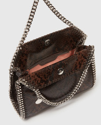 Item 371223WP06212035U A more compact version of our iconic vegan luxury bag, the Falabella mini tote bag is small but mighty. Consciously crafted from a mycelium-based, vegan alternative to snakeskin and finished with a diamond-cut chain made from recycled brass and aluminum, this tote has a handy inside slip pocket and monogrammed lining made from post-consumer recycled polyester. - Color: Espresso - Comfortably fits all phones and wallets alongside small daily essentials - YATAY M mycelium-based cruelty-free, vegan alternative to snakeskin - Signature ruthenium recycled brass and aluminum diamond-cut chain - Waxed GOTS-certified organic cotton lacing - Two top handles, and one shoulder strap - One main compartment - One internal slip pocket - Magnetic snap fastening - Engraved ruthenium logo medallion charm - Recycled polyester monogram lining - Handcrafted in Italy Product Care & Fit Advice - Care: Spot clean only with soft damp cloth. - Composition: 100% Polyester - Fits all phones and wallets - Size: 10.4 in × 9.3 in × 3.9 in - Handle drop: 4.3 in - Strap length: 18.5 in - Weighs approximately 26.1 oz