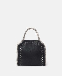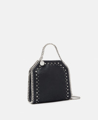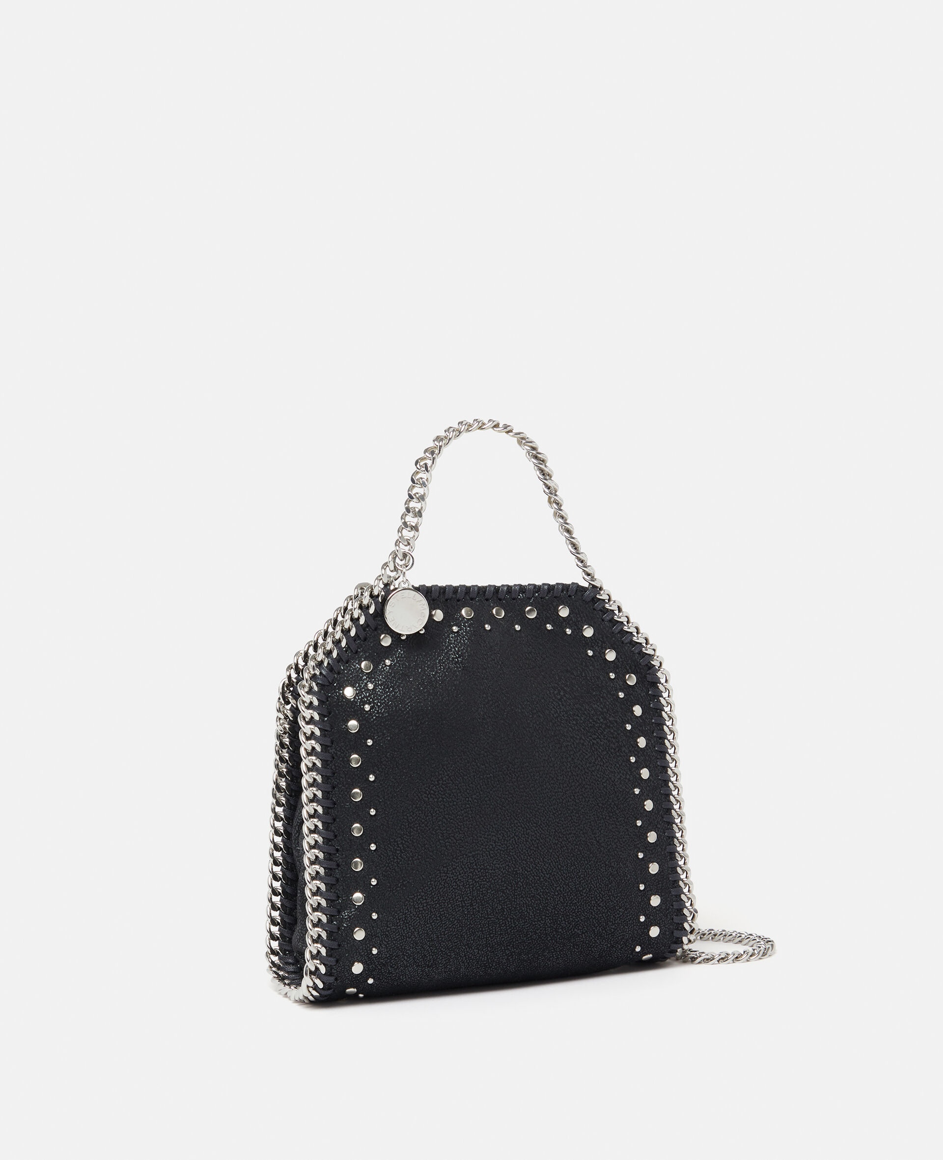 Item 391698WP04091000U Elevate everyday dressing with the punky edge of this iconic Stella McCartney Falabella Tiny tote bag. Responsibly made from our signature grained Shaggy Deer fabric, this vegan tote bag is framed by a recycled brass and recyclable aluminum diamond-cut chain, punctuated with silver studs borrowed from ready-to-wear and lined with recycled materials. There’s a slip pocket inside for smaller treasures, while the main compartment can stash your keys and lipstick. - Color: Black - Pitch black - Comfortably fits all phones alongside small daily essentials - Mat Shaggy Deer vegan leather alternative with semi-gloss grain - Signature recycled brass and recyclable aluminum diamond-cut chain - Waxed GOTS-certified organic cotton lacing - Silver studs - Two top handles, one shoulder strap - One main compartment - One internal slip pocket - Magnetic snap fastening - Engraved ruthenium logo medallion charm - Recycled polyester monogram lining - Made in Italy Product Care & Fit Advice Care: Spot clean only with soft damp cloth Composition: Main fabric: 100% polyester All Stella McCartney shoes and accessories are made from non-leather materials in keeping with our cruelty-free ethos. - Size: 7 x 6.9 x 2.4 in - Handle drop: 2.7 in - Strap length: 18.5 in - Weighs approximately 0.44kg - Fits all phones alongside small daily essentials
