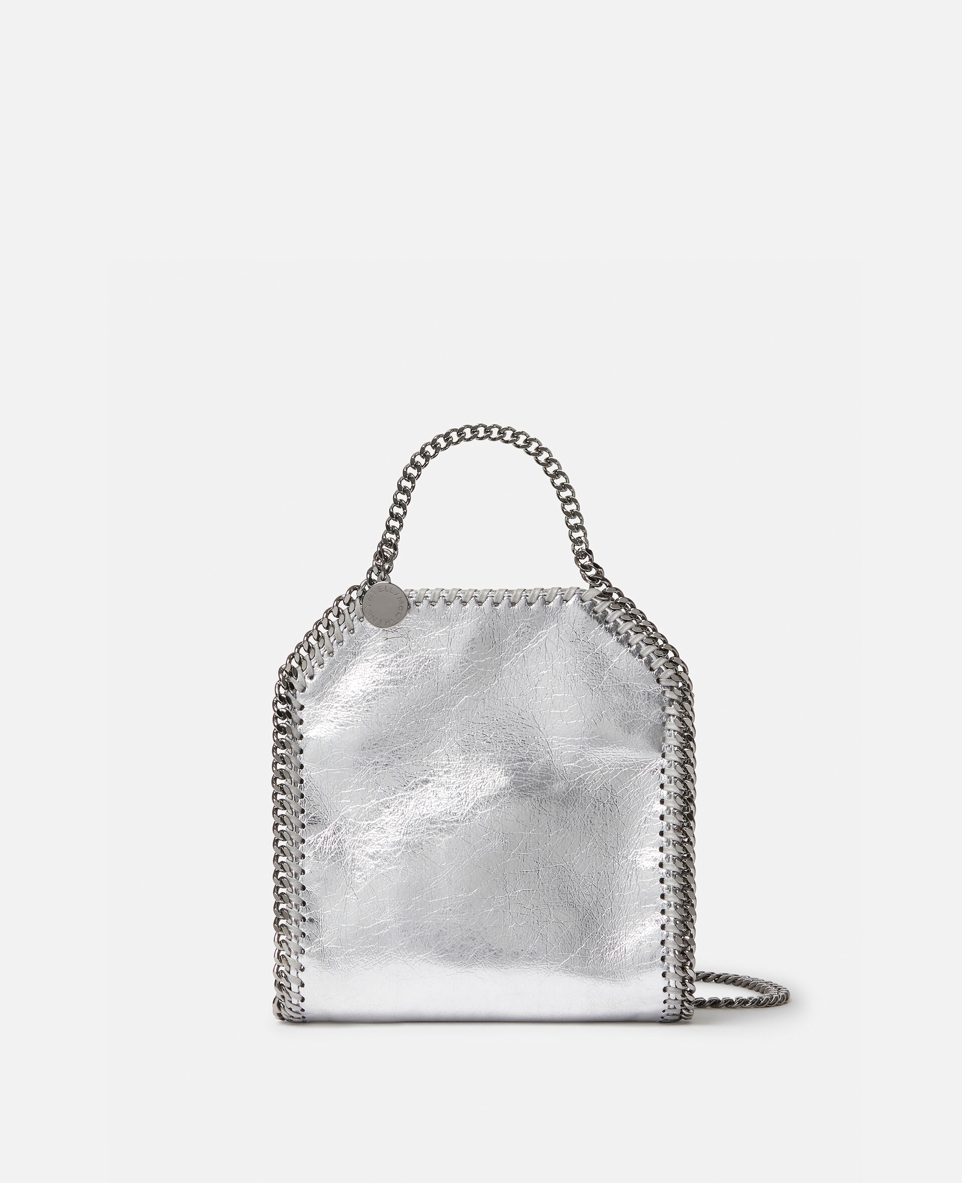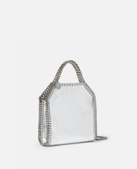 - Color: Metallic Silver - Falabella Mini Tote - Signature silver diamond-cut chain - Inside slip pocket, snap fastening - Made in: Italy Product Care & Fit Advice - Care: Spot clean only with soft damp cloth - Composition: Main Material 70% Recycled Polyester, 30% Polyurethane, Lining 100% Recycled Polyester, Details 70% Polyurethane, 30% Recycled Polyester - Do not machine wash - Do not bleach - Do not tumble dry - Do not iron - Do not dry clean - Clean with a damp clot - Size: 7x6.9x2.4 in. - Handle drop: 2.8" - Strap: 18.5" - Weighs approximately 0.95 lbs. - All of our shoes and accessories are made from non-leather materials as part of our cruelty-free ethos.