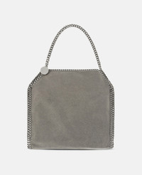 Our Falabella tote bag is an edgy and conscious choice for everyday wear. Crafted from matte Shaggy Deer fabric with a unique semi-gloss grain finish, its distinctive diamond-cut chain radiates wear-anytime appeal and can be carried by its top handles for an endlessly adaptable look. - Colour: Grey - Medium steel grey - Matte vegan Shaggy Deer fabric with semi-gloss grain - Signature ruthenium recycled brass and aluminium diamond-cut chain - Waxed GOTS-certified organic cotton lacing - Two top handles - One main compartment - One internal slip pocket - Magnetic snap fastening - Engraved ruthenium logo medallion charm - Recycled polyester monogram lining - Made in Italy Product Care & Fit Advice - Care: Use a soft damp cloth with a small amount of demineralised water (likewise for ironing) and apply to all the material. Leave the bag to dry. Avoid scrubbing to prevent damaging the surface of the bag. As this accessory is made from very delicate fabric, we recommend handling with care and avoiding contact with any sharp objects, jewellery, or rough surfaces. When not in use, always store the item in its protective bag. - Composition: Main fabric: 55% polyester, 45% GRS-certified Newlife™ post-consumer recycled polyester, Trims: 70% solventless polyurethane, 30% post-consumer recycled polyester, Lacing: 100% GOTS-certified organic cotton with corn starch wax coating, Handle/strap: 100% recycled brass, Body chain: 100% aluminium, Medallion: 100% zamac, Magnet: 100% stainless steel, Lining: GRS-certified post-consumer recycled polyester - Size: 37 x 35 x 7cm / 14.5 x 13.7 x 2.7in. - Handle drop: 20cm - Weighs approximately 0.85kg - All of our shoes and accessories are made from non-leather materials in keeping with our cruelty-free ethos.