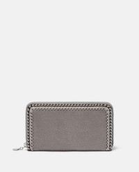 Item 434750W91321220U Our iconic diamond-cut chain frames this Falabella continental wallet, lending it a distinctive edge. With two main compartments, a coin pocket and space for up to eight credit cards, this wallet has more than enough for all of your shopping essentials. - Colour: Grey - Medium steel grey - Matte vegan Shaggy Deer fabric with semi-gloss grain - Signature ruthenium recycled brass and aluminium diamond-cut chain - Waxed GOTS-certified organic cotton lacing - Two main compartments - Zip coin pocket - Eight card slots - Zip-around fastening - Engraved ruthenium zamac logo medallion charm - Fully lined with recycled materials - Made in Italy Product Care & Fit Advice - Care: Use a soft damp cloth with a small amount of demineralised water (likewise for ironing) and apply to all the material. Leave the bag to dry. Avoid scrubbing to prevent damaging the surface of the bag. As this accessory is made from very delicate fabric, we recommend handling with care and avoiding contact with any sharp objects, jewellery, or rough surfaces. When not in use, always store the item in its protective bag. - Composition: Main fabric: 55% polyester, 45% GRS-certified Newlife™ post-consumer recycled polyester, Trims: 70% solventless polyurethane, 30% post-consumer recycled polyester, Lacing: 100% GOTS-certified organic cotton with corn starch wax coating, Chain: 100% aluminium, Medallion: 100% zamac, Magnet: 100% stainless steel, Lining: GRS-certified post-consumer recycled polyester - Size: 14.5 x 9cm / 5.7 x 3.5in. - Weighs approximately 0.078kg - All of our shoes and accessories are made from non-leather materials in keeping with our cruelty-free ethos.