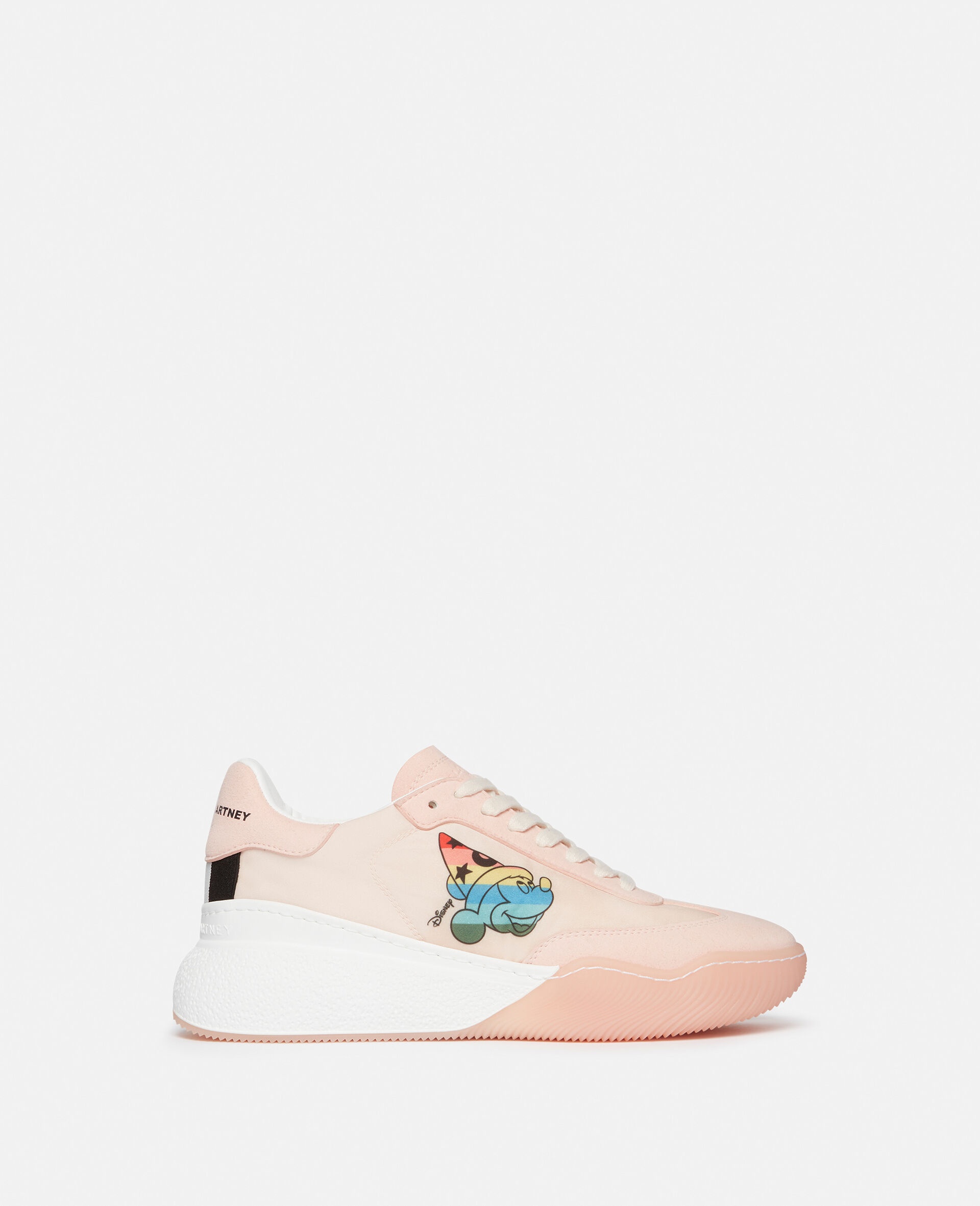Our latest unisex capsule blends fashion and fantasy, escaping reality through conscious wardrobe staples featuring new Disney Fantasia prints, original graphics and vibrant psychedelia – bringing together two of the world’s most iconic creative forces around shared values and ageless visuals from the classic animated film. - Color: Pastel Pink - Loop lace-up sneakers - Pumped-up sole - Stella McCartney logo - Rainbow Mickey graphic on the sides - Made in: Italy - Care: Spot clean only with soft damp cloth - Composition: Upper 66% Recycled Polyester, 30% Polyester, 4% Polyurethane; Lining 100% Bamboo; Outsole 60% Polyurethane, 40% Thermoplastic Polyurethane Product Care & Fit Advice - 40 mm/1.6 in. platform - Fits true to size - All of our shoes and accessories are made from non-leather materials as part of our cruelty-free ethos.