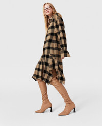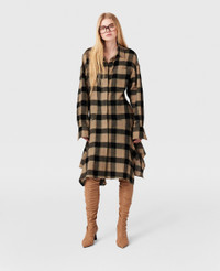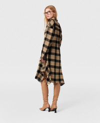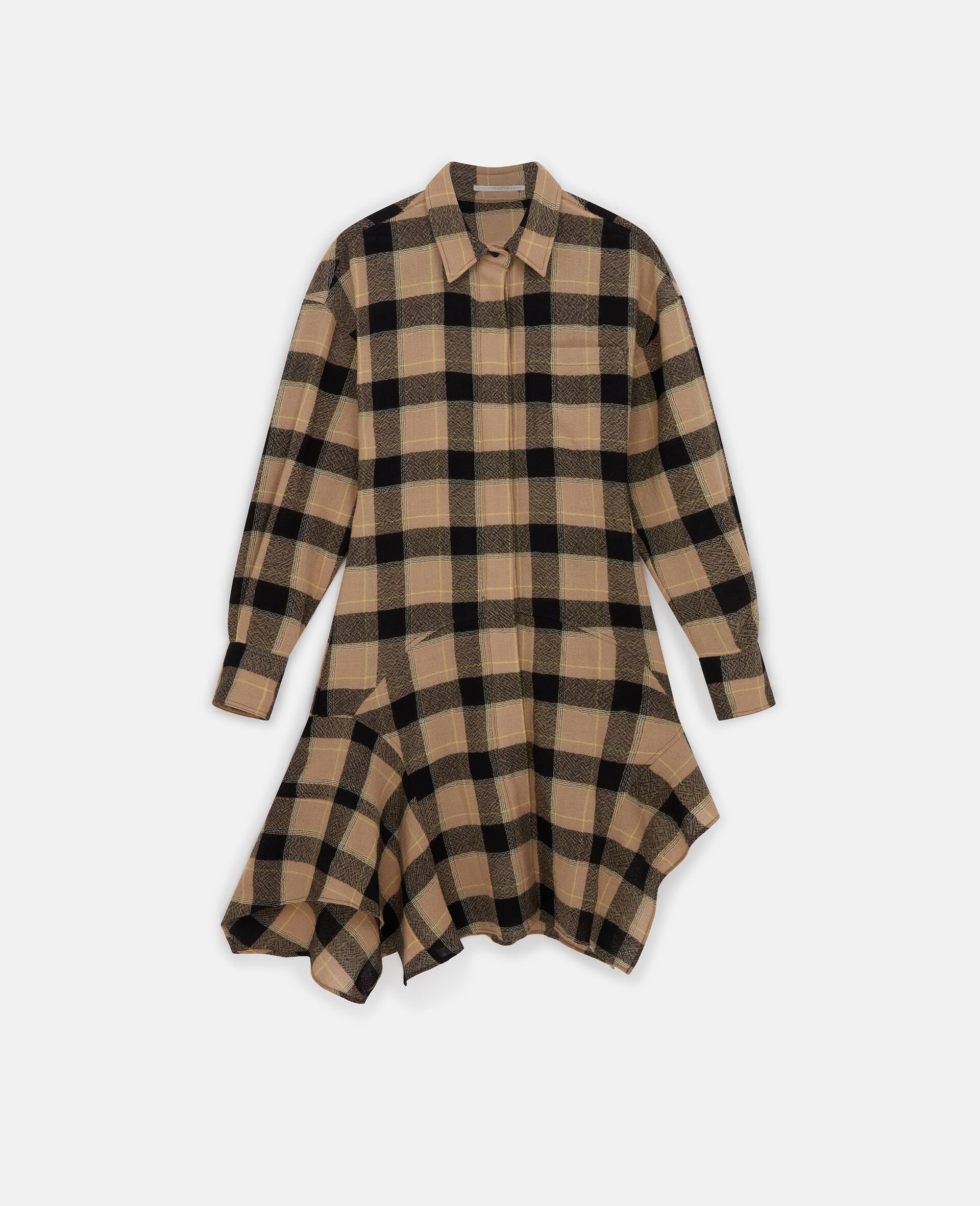 Item 6A03373EQ7039704 Exhibiting Stella McCartney’s Savile Row tailoring skills, this dress is crafted from soft, beige and black check RWS-certified wool. A wardrobe classic elevated, a skirt begins where a shirt would end, further shaped by kick-flare slits on either side. - Color: Beige - Beige and black check - Collar - Long sleeves - Tonal buttons - Kick flares on sides of skirt - Buttoned cuffs - Button fastening - Made in Italy Product Care & Fit Advice Care: Dry clean only Composition: Main fabric: 100% wool - Size: Fits true to size - Designed for a regular fit - Midweight, non-stretch fabric
