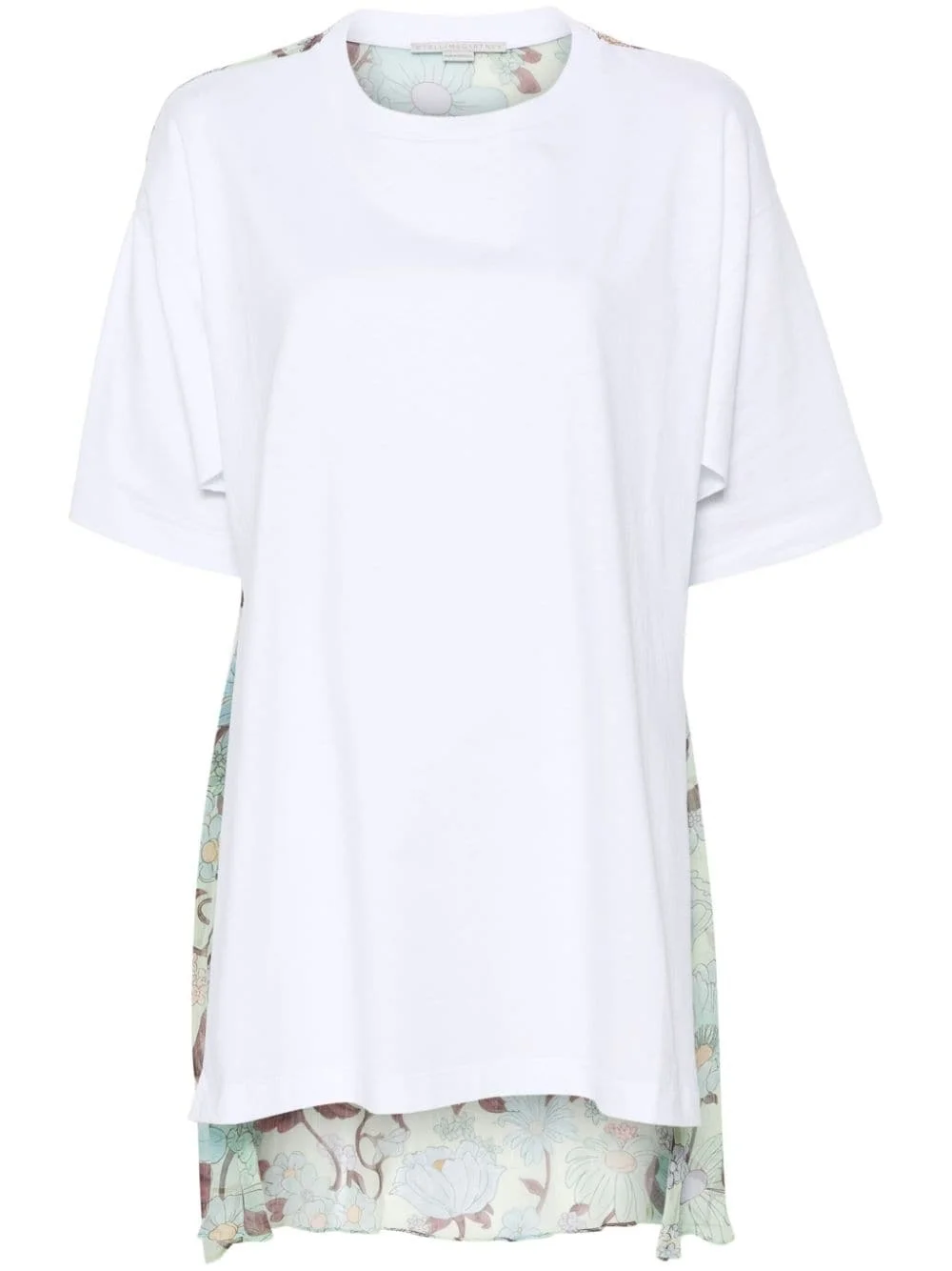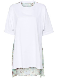 floral-print panel T-shirt Stella McCartney updates the classic white T-shirt with a delicate design. The white cotton construction is enhanced by a floral-print silk panel at the rear. Highlights - White/multicolour - Cotton/silk - Round neck - Drop shoulder - Short sleeves - Floral print to the rear - High-low hem Imported Composition Silk 100%, Cotton 100% SIZE & FIT Model measurements Height 5 ft 10 in(1.77 m) Bust/Chest 34.64 in(88 cm) Hips 35.43 in(90 cm) Waist 24.8 in(63 cm) FittingInformation Designed to be unstructured, offering a loose fit throughout Made from a lightweight fabric This piece fits true to size – take your usual size Washing instructions Dry Clean Only
