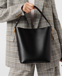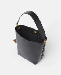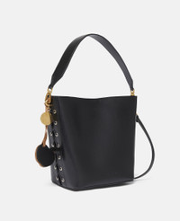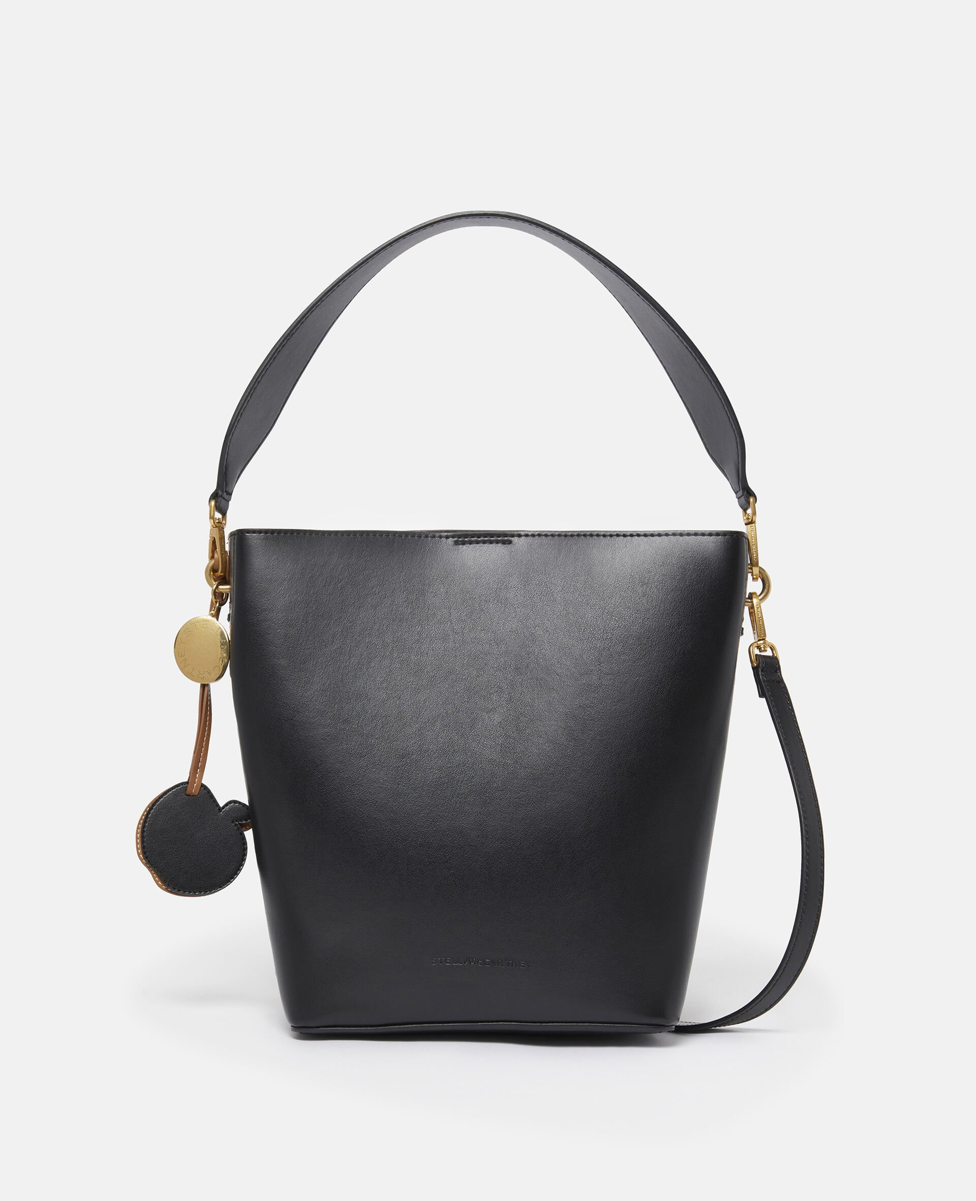 Item 7B0108WP03801000U This Frayme bucket bag from Stella McCartney is innovated from smooth UPPEAL™, an apple-based leather alternative harnessing industrial symbiosis to repurpose food waste. With whipstitched sides, a detachable top handle and a rounded square shape, it’s perfect for city-to-country wear – keep your daily essentials, phone and wallet at arm’s reach, no matter the scenery. - Color: Black - Pitch black - Comfortably fits all phones and wallets alongside daily essentials - UPPEAL™ vegan alternative to animal leather sourced from apple waste - Whipstitching on both sides - Waxed GOTS-certified organic cotton lacing - One removable top handle and one adjustable, removable shoulder strap - One main compartment - One internal slip pocket - Drawstring closure - Engraved ruthenium logo medallion charm - Detachable UPPEAL™ apple charm - Recycled nylon monogram lining - Made in Italy Product Care & Fit Advice Care: Spot clean only with soft damp cloth Composition: Main fabric: 56% polyester 44% cotton All Stella McCartney shoes and accessories are made from non-leather materials in keeping with our cruelty-free ethos. - Size: 7.8 x 9.8 x 5.5 in - Strap length: 22.4 in - Weighs approximately 1.2 lbs - Fits all phones, wallets and small daily essentials