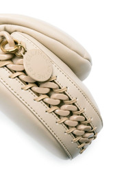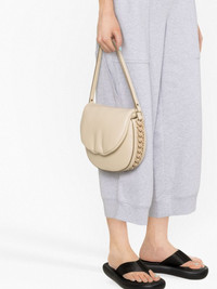 Frayme chain-link faux-leather shoulder bag First introduced for SS22, the Frayme bag has quickly become a Stella McCartney signature. This shoulder iteration is crafted from supple faux leather in a padded half-moon shape. The chain links are whipstitched along the sides. Highlights - Light beige - Faux leather - Chain-link detailing - Interwoven strap detailing - Adjustable detachable shoulder strap - Foldover top with magnetic fastening - Main compartment Made in Italy Composition Outer: Polyester 65%, Polyurethane 35% Lining: Polyurethane 56%, Polyester 44% SIZE & FIT Model measurements Height 5 ft 9 in(1.75 m) Bust/Chest 31.88 in(81 cm) Hips 33.85 in(86 cm) Waist 24.01 in(61 cm) Measurement DEPTH 2.75 in(7 cm) HEIGHT 7.48 in(19 cm) WIDTH 9.05 in(23 cm)
