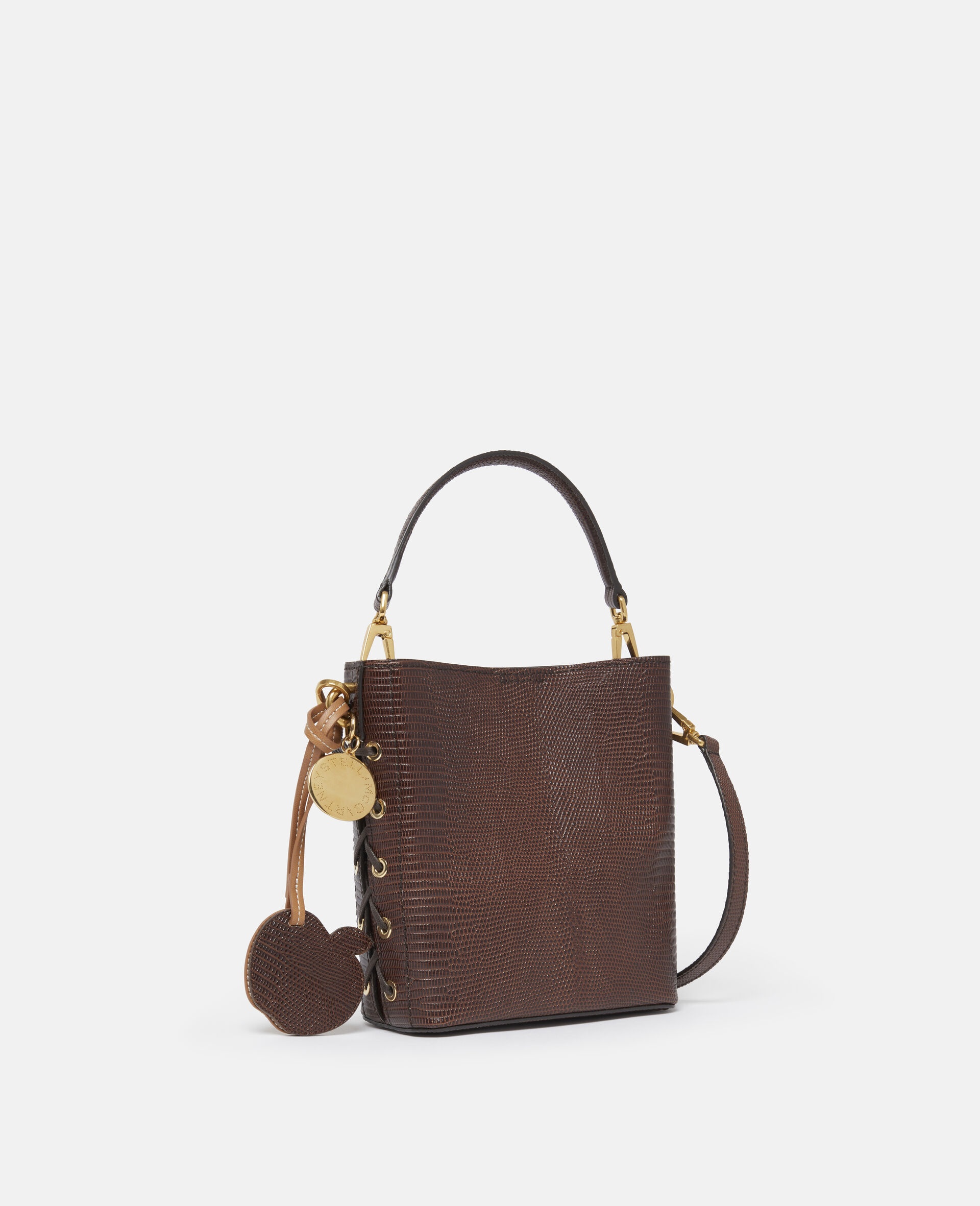 Item 7B0093WP04262012U Innovated from scale-embossed UPPEAL™, this Frayme mini square bucket bag is crafted from an apple-based vegan alternative to animal leather, in keeping with our conscious values. The bucket bag has an elegant, subtle debossed logo front and can be carried in two ways: by its top handle or using its adjustable crossbody strap. Stash your phone and keys away safely in the main compartment, use the slip pocket to stow away emergency top-up essentials. - Color: Brown - Chocolate brown - Comfortably fits all phones and wallets alongside small daily essentials - Scale-embossed UPPEAL™ vegan alternative to animal leather sourced from apple waste - Whipstitching on both sides - Waxed GOTS-certified organic cotton lacing - One removable top handle and one adjustable, removable shoulder strap - One main compartment - Drawstring closure - Engraved ruthenium logo medallion charm - Detachable UPPEAL™ apple charm - Recycled nylon monogram lining - Made in Italy Product Care & Fit Advice Care: Spot clean only with soft damp cloth Composition: Main fabric: 56% polyester 44% cotton All Stella McCartney shoes and accessories are made from non-leather materials in keeping with our cruelty-free ethos. - Size: 7.1 x 6.9 x 3.1 in - Handle drop: 2.7 in - Strap length: 22.4 in - Weighs approximately 11.3 oz - Fits all phones, wallets and small daily essentials