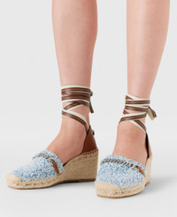 Item 810510E002124004 Consciously crafted from regenerative cotton denim boucle, these Gaia espadrilles are defined by a recycled polyester ribbon lace-up for a free-spirited attitude. This pair is elevated by a braided jute wedge heel and an iconic Falabella chain handstitched across the toe. - Color: Dark blue denim - 70mm heel - Regenerative cotton denim boucle upper - Recycled polyester ribbon lace-up ankle strap - Angular square toe - Braided jute wedge heel - Handcrafted in Spain Product Care & Fit Advice Care: Spot clean only with soft damp cloth Composition: Main fabric: 100% cotton Fit: Size: Fits true to size Heel height: 70mm with a 40mm pitch