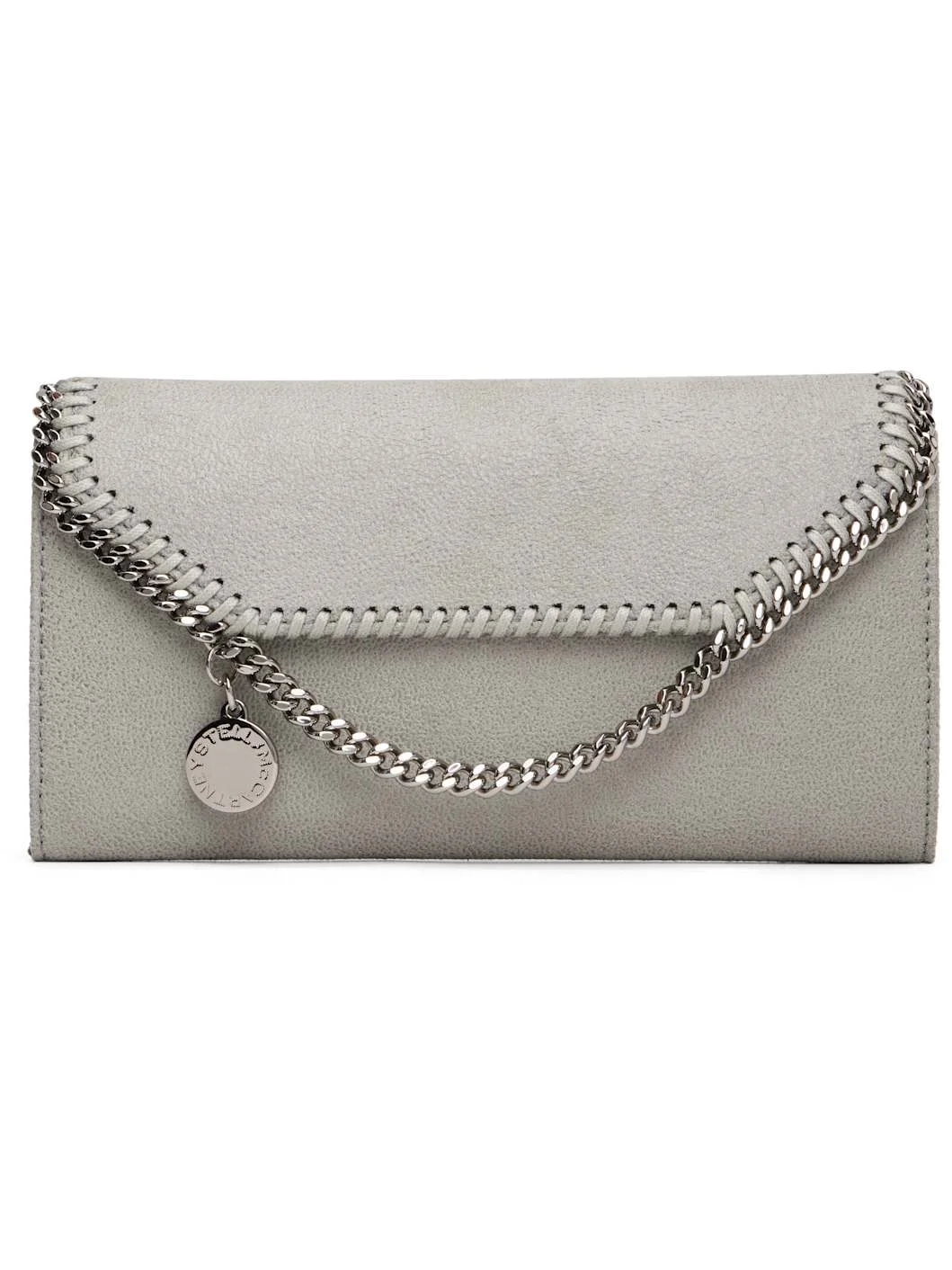 Handcrafted grained faux-leather shoulder bag. GOTS-certified organic cotton whipstitching throughout. · Detachable curb chain crossbody strap · Logo charm at face · Curb chain trim at foldover flap · Magnetic press-stud closure · Zip pocket and card slots at interior · Satin lining · H4" x W7.75" x D0.75" Made from cruelty-free, non-animal materials. Supplier color: Light grey Synthetic. Made in Italy 261471F048003