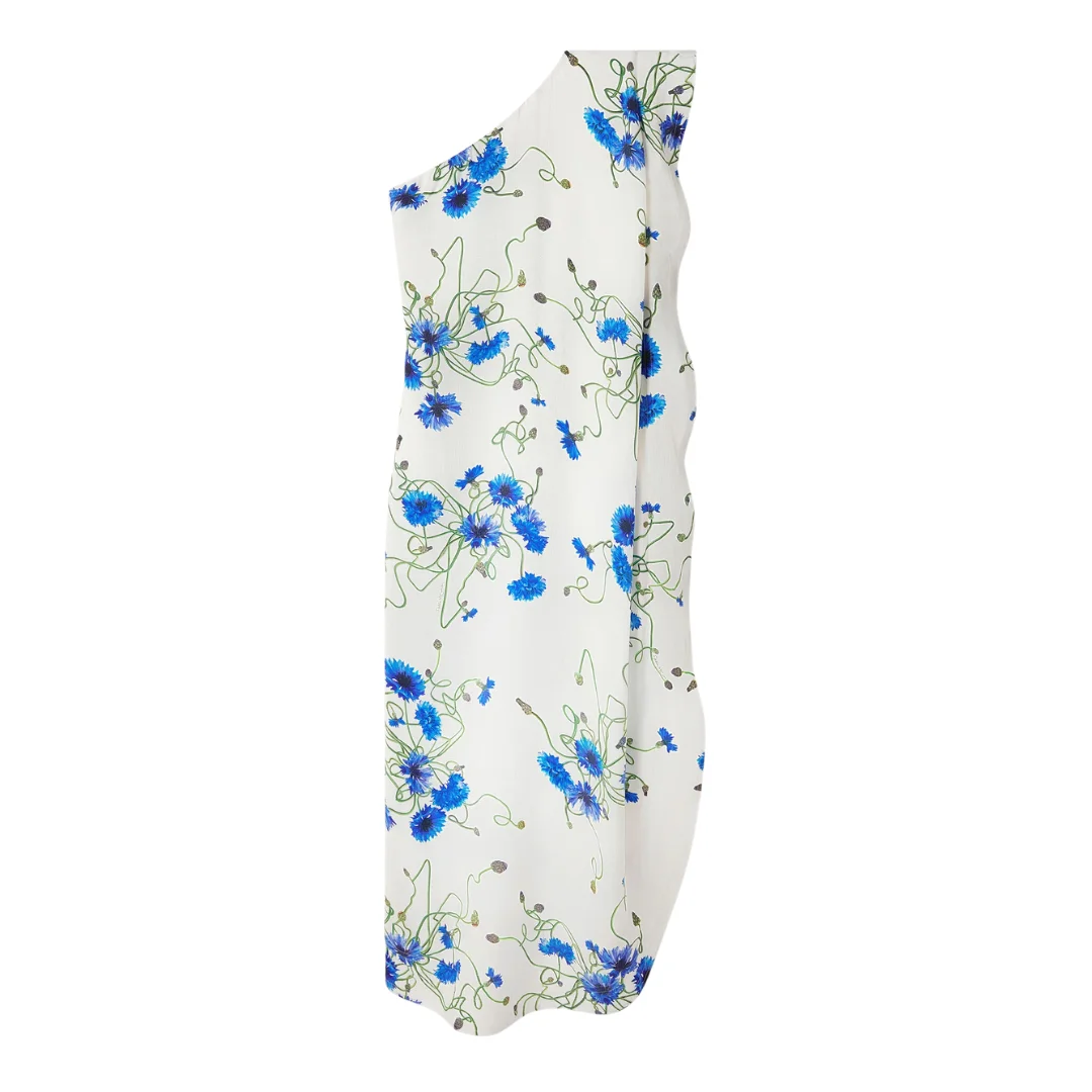 Fluid and expressive, this asymmetric cocktail dress showcases a cornflower print across hammered blend of organic silk and forest-friendly viscose, designed to catch light and movement. Its modern cut and directional hemline reflect Stella McCartney’s signature blend of softness and strength. - Color: Cornflower print - Organic silk with a hammered texture - All-over floral print - Asymmetric hemline - Sleeveless silhouette - Lightweight, fluid drape - Made in Italy