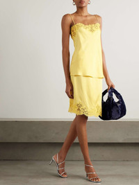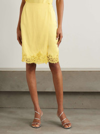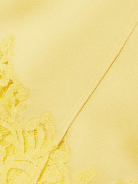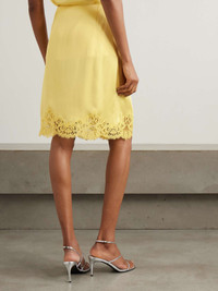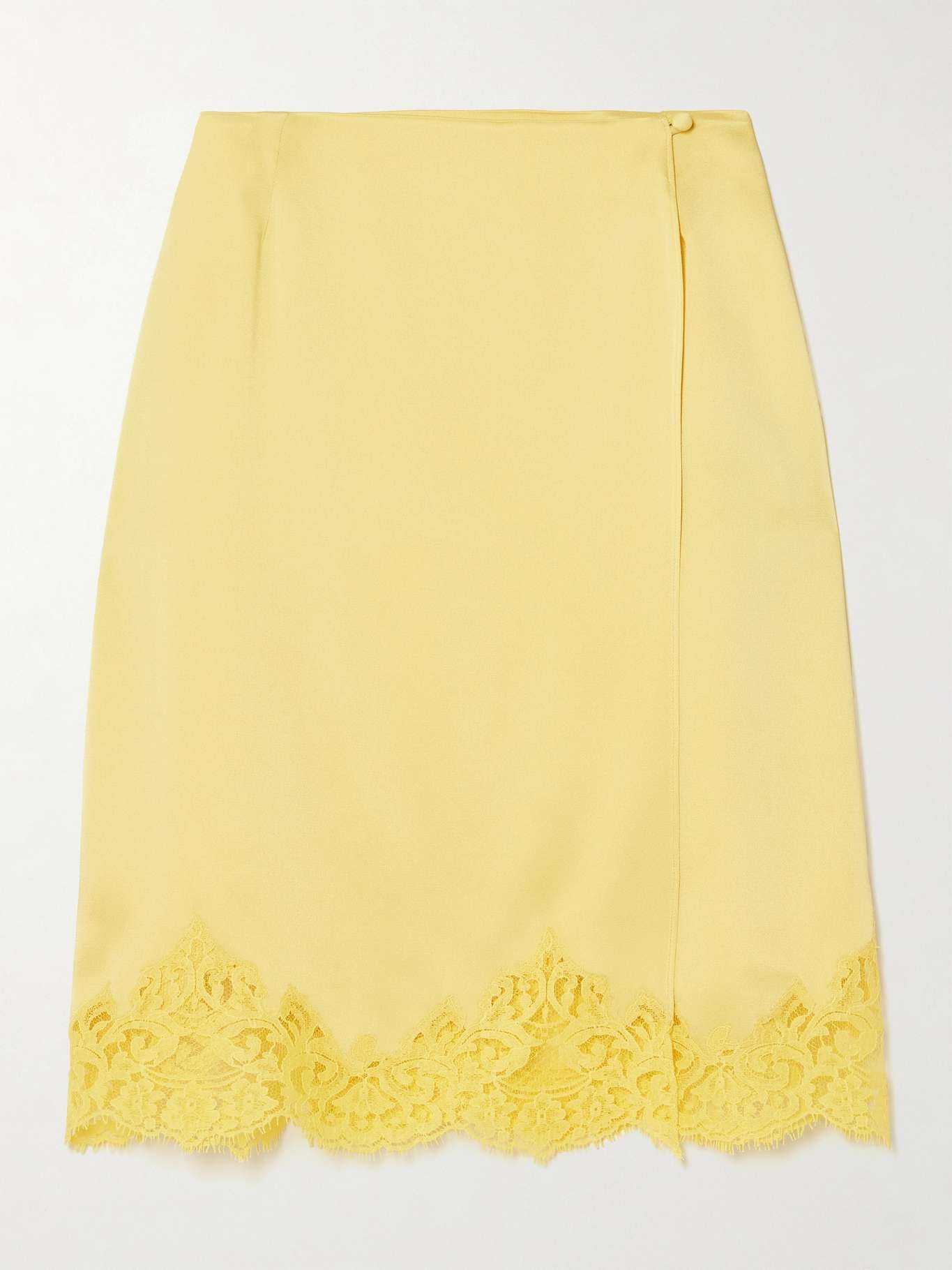 EDITORS'NOTES Stella McCartney's wrap-effect skirt is timelessly chic, so it lives up to the 'Iconic' name. Cut from satin in a soft shade of 'Camomile', it's traced with dainty lace along the hem. Every detail is considered, including the covered button fastening. Lower-Impact Materials. This product is made using at least 50% lower-impact materials or ingredients. Find out more about our NET SUSTAIN criteria here. SIZE & FIT Model measurements: - Fits true to size, however those who are between sizes should take the smaller size - Falls above the knee, designed to be worn just below the natural waist - Mid-weight, fluid, non-stretchy fabric - Model is 180cm/ 5'11" and is wearing an IT 38 - Bust: 76cm/ 30" - Waist: 64cm/ 25" - Hip: 86cm/ 34" DETAILS & CARE - Yellow satin and lace - Partially concealed button fastenings at front - 73% acetate, 27% viscose - Dry clean