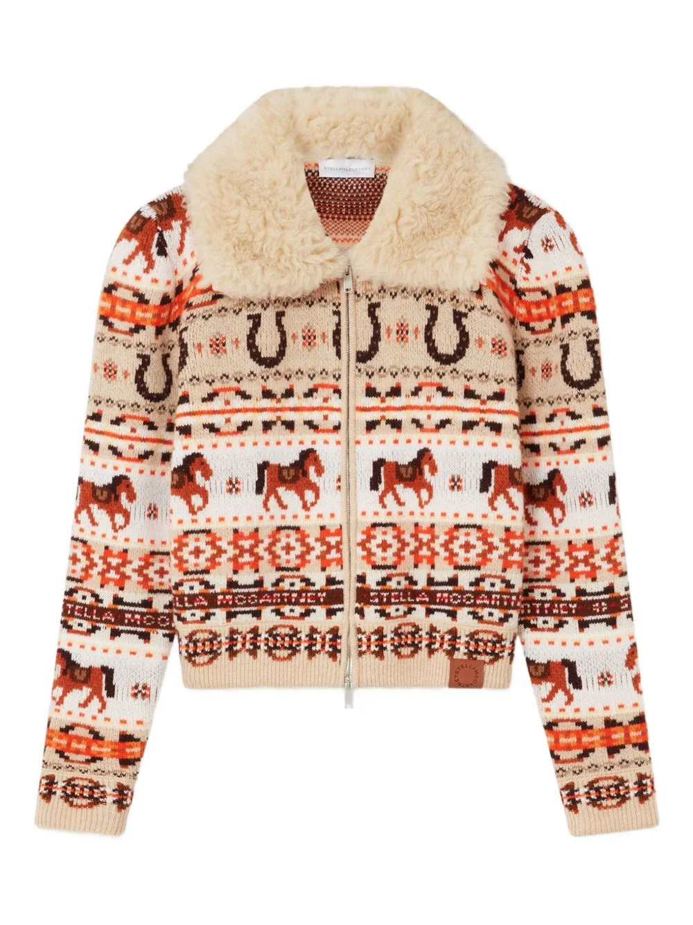 textured-collar patterned jacket Highlights - Beige and red - Fair isle-patterned - Faux-fur-collar - Zip-fastening - Long-sleeves - Ribbed hem Made in Italy Composition RWS Virgin Wool 100% Washing instructions Dry Clean Only