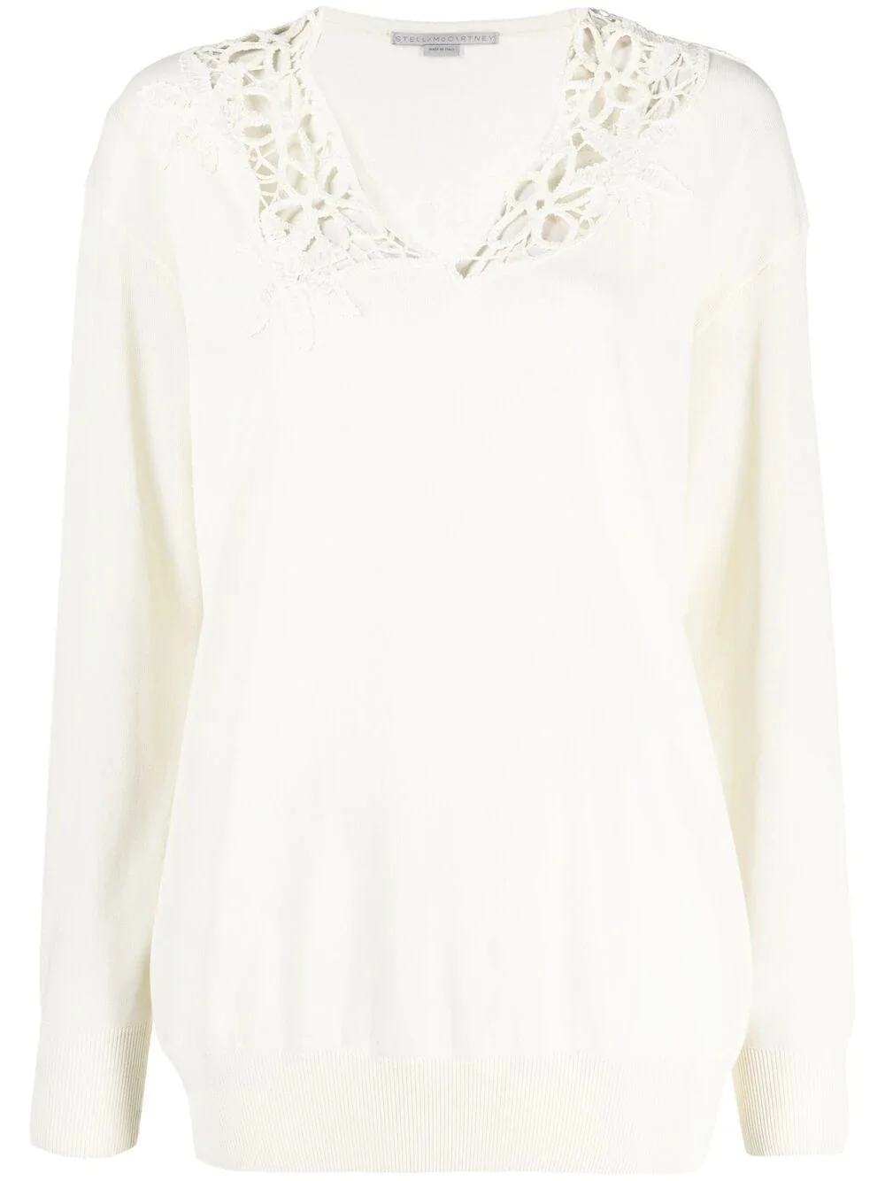 lace-detail V-neck jumper With an elegant feel, this lace-detail Stella McCartney jumper is right up your street. Picture yourself wearing it...then make that dream a reality. Highlights - White - V-neck - Lace detailing - Drop shoulder - Long sleeves - Ribbed-knit edge Made in Italy Composition Viscose 70%, Cotton 30% Washing instructions Dry Clean Only