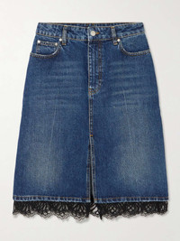 EDITORS'NOTES Stella McCartney's midi skirt is trimmed with intricate lace at the hem for a layered effect. It's made from blue denim that's lightly faded and is spliced with a subtle slit at the front. Wear yours with everything from crisp shirts to tanks. SIZE & FIT Model measurements: - Fits true to size, take your normal size - Knee-length, designed to be worn just below the natural waist - Mid-weight, non-stretchy fabric - Model is 177cm/ 5'10" and is wearing a size Small - Bust: 80cm/ 31.5" - Waist: 65cm/ 25.5" - Hip: 89cm/ 35" DETAILS & CARE - Blue denim, black lace - Button and zip fastening at front - 100% cotton; trim: 100% polyamide; lining: 57% polyester, 40% cotton, 3% viscose - Hand wash or dry clean