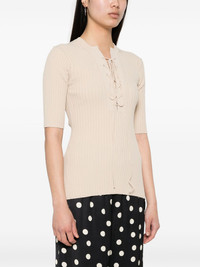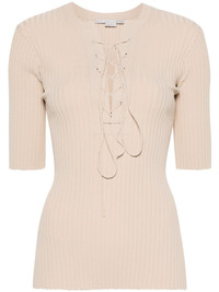 lace-up ribbed top Highlights - Sand beige - Ribbed knit - Crew neck - Half-length sleeves - Straight hem - Front lace-up fastening Made in Italy Composition Viscose 83%, Polyester 17% SIZE & FIT Model measurements Height 5 ft 10 in(1.77 m) Bust/Chest 31.49 in(80 cm) Hips 35.82 in(91 cm) Waist 25.98 in(66 cm) FittingInformation Designed for a close fit throughout Made with a midweight knit, this piece offers some stretch This piece fits true to size – take your usual size